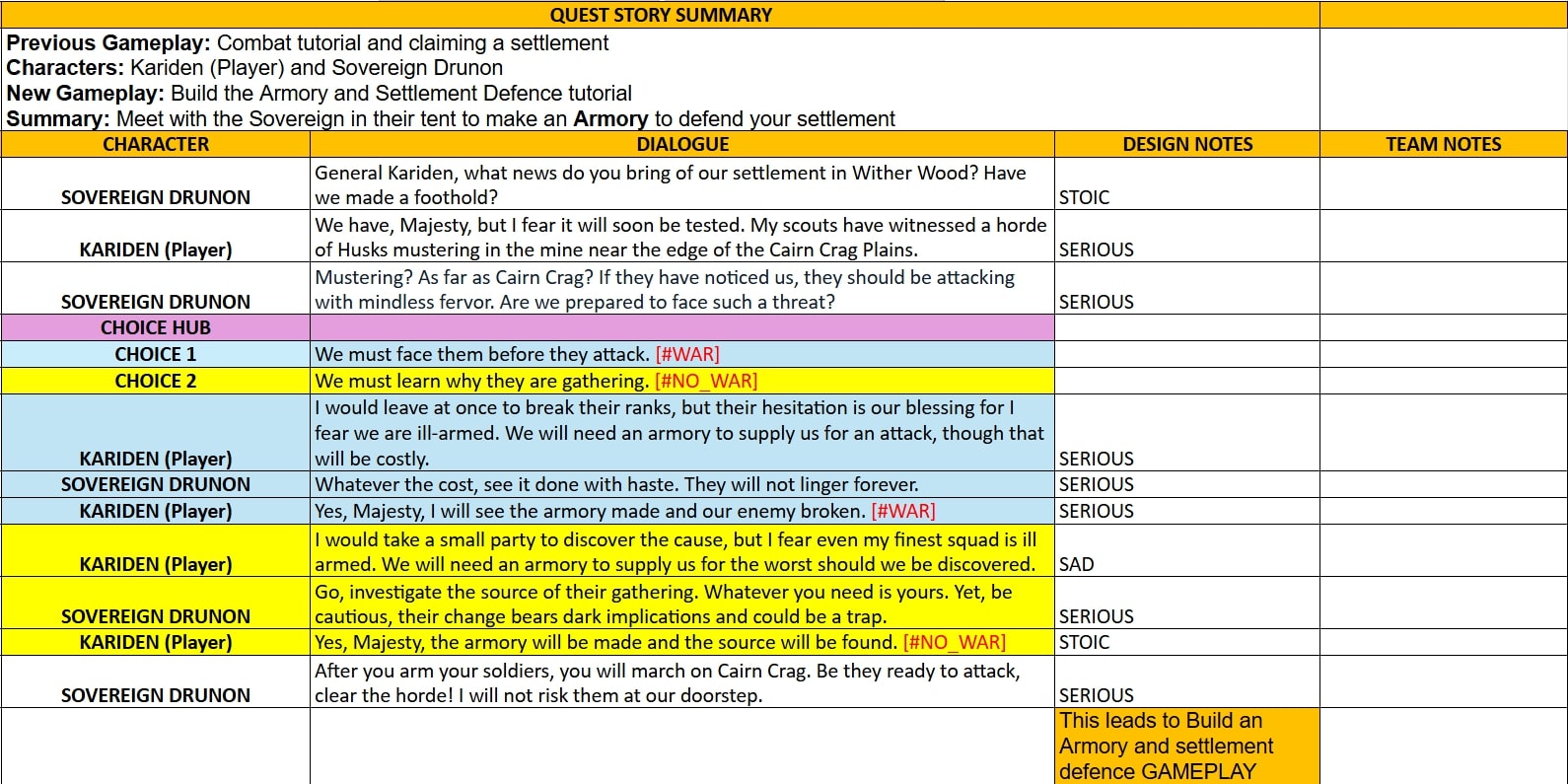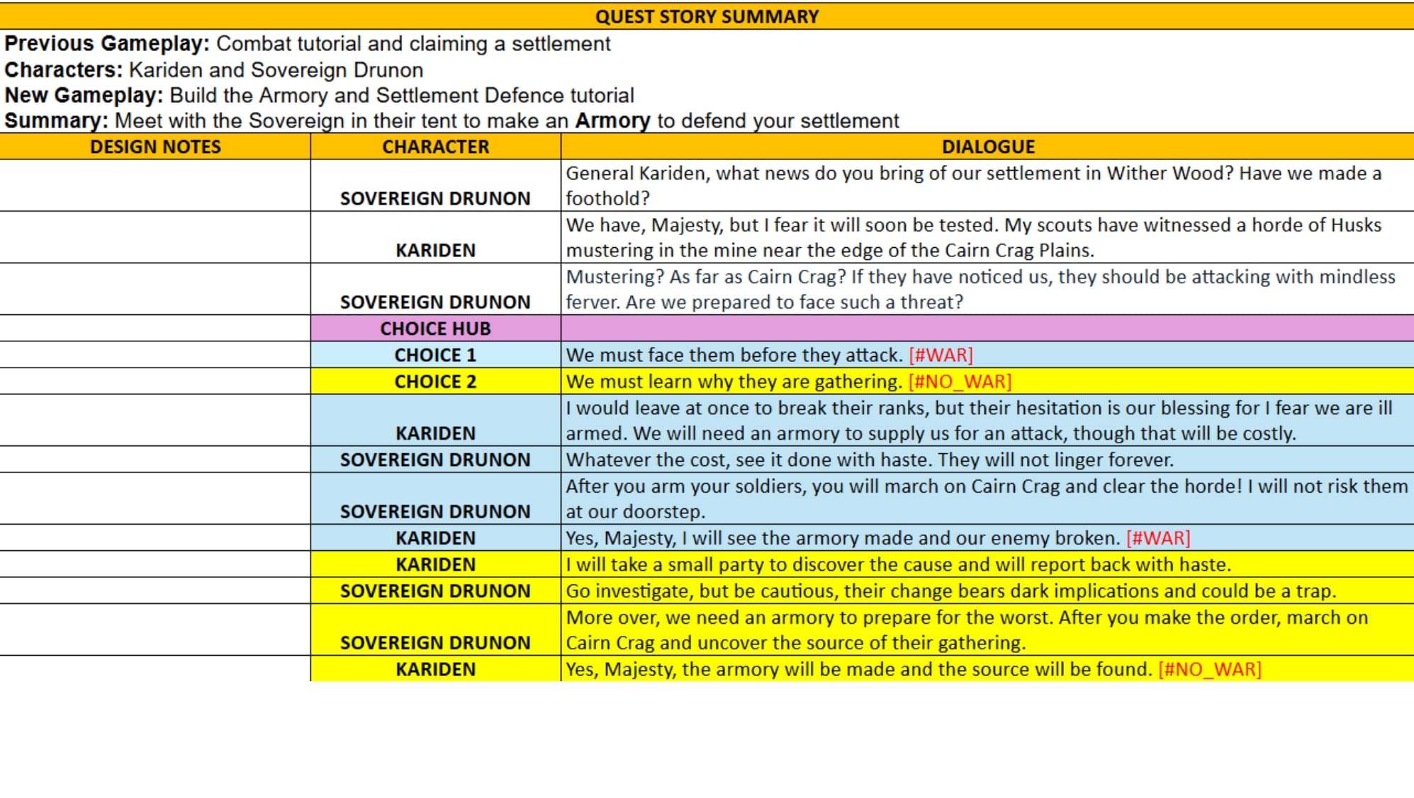 Designed linear dialogue threads to proof story to gameplay functionality for both cutscenes and tutorial quests with the following considerations: