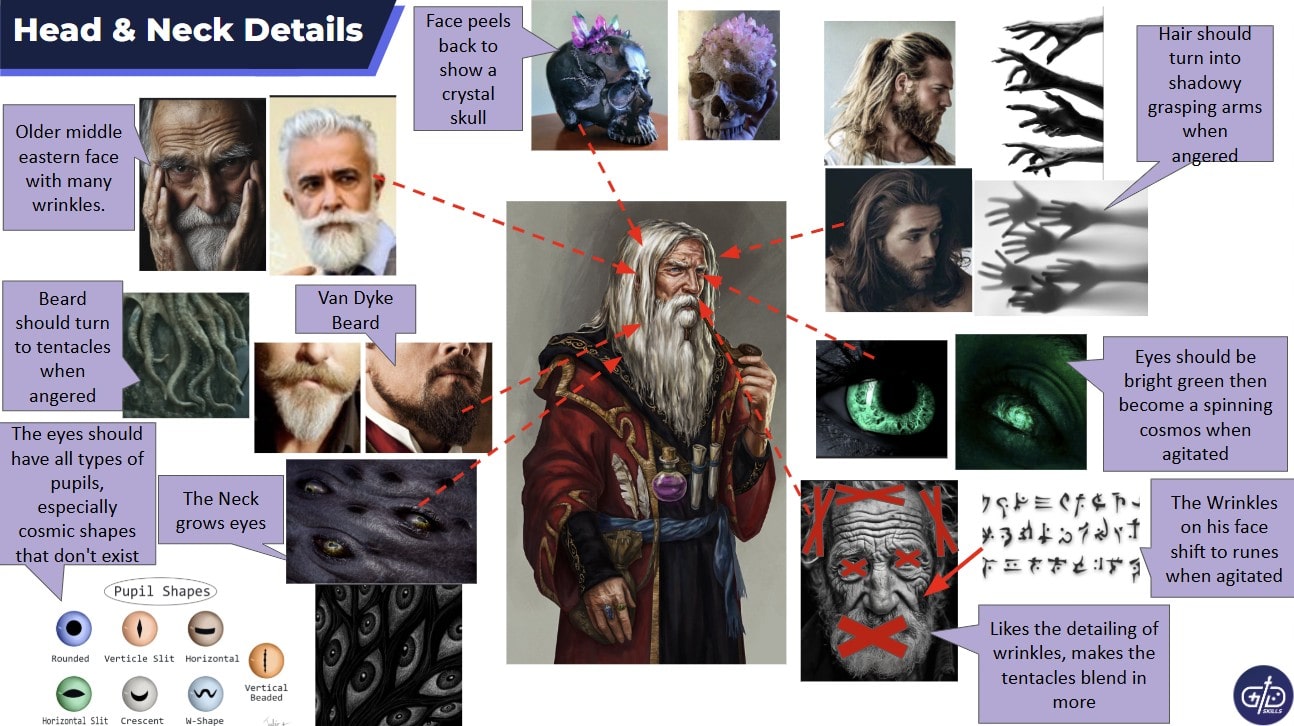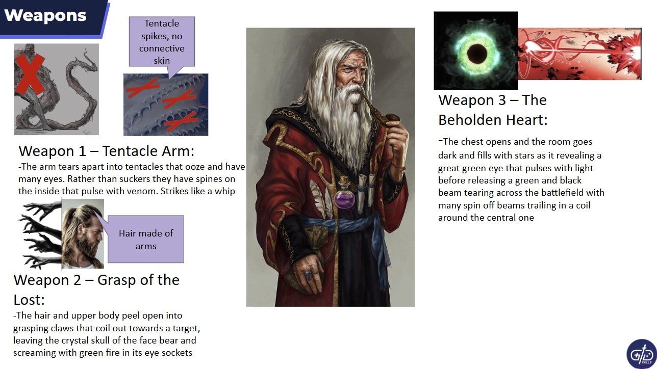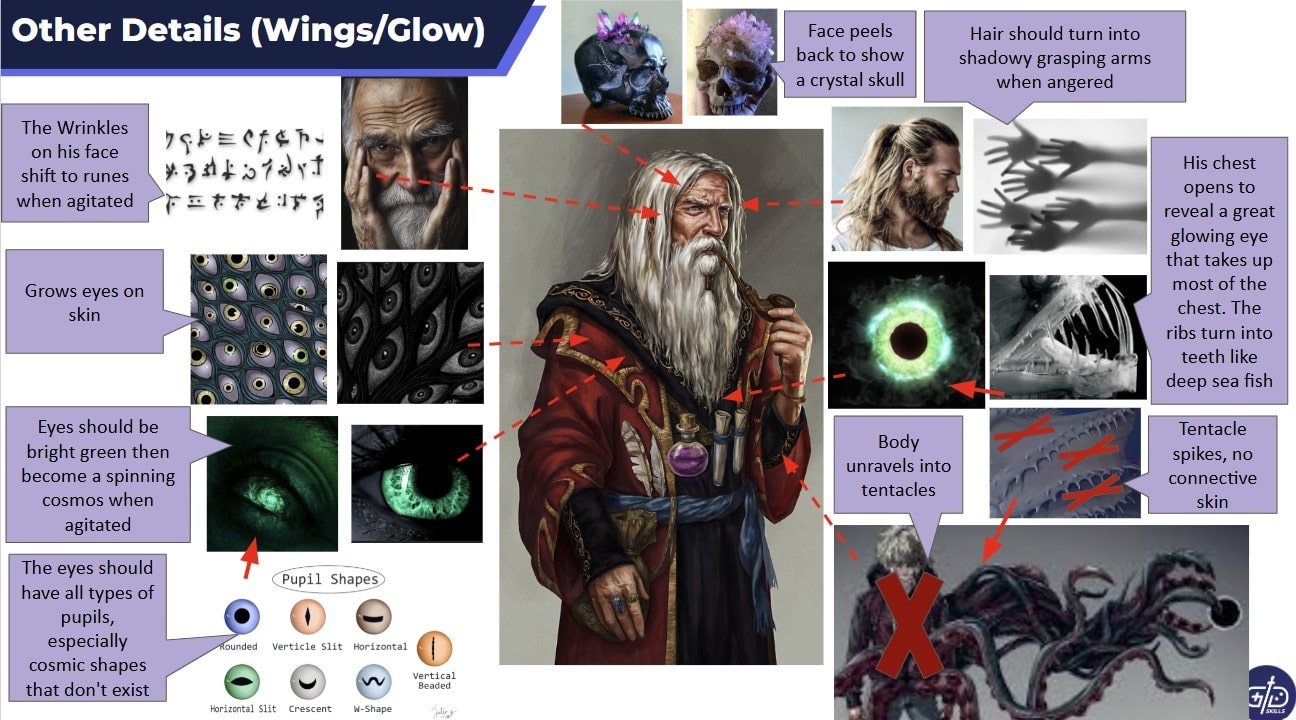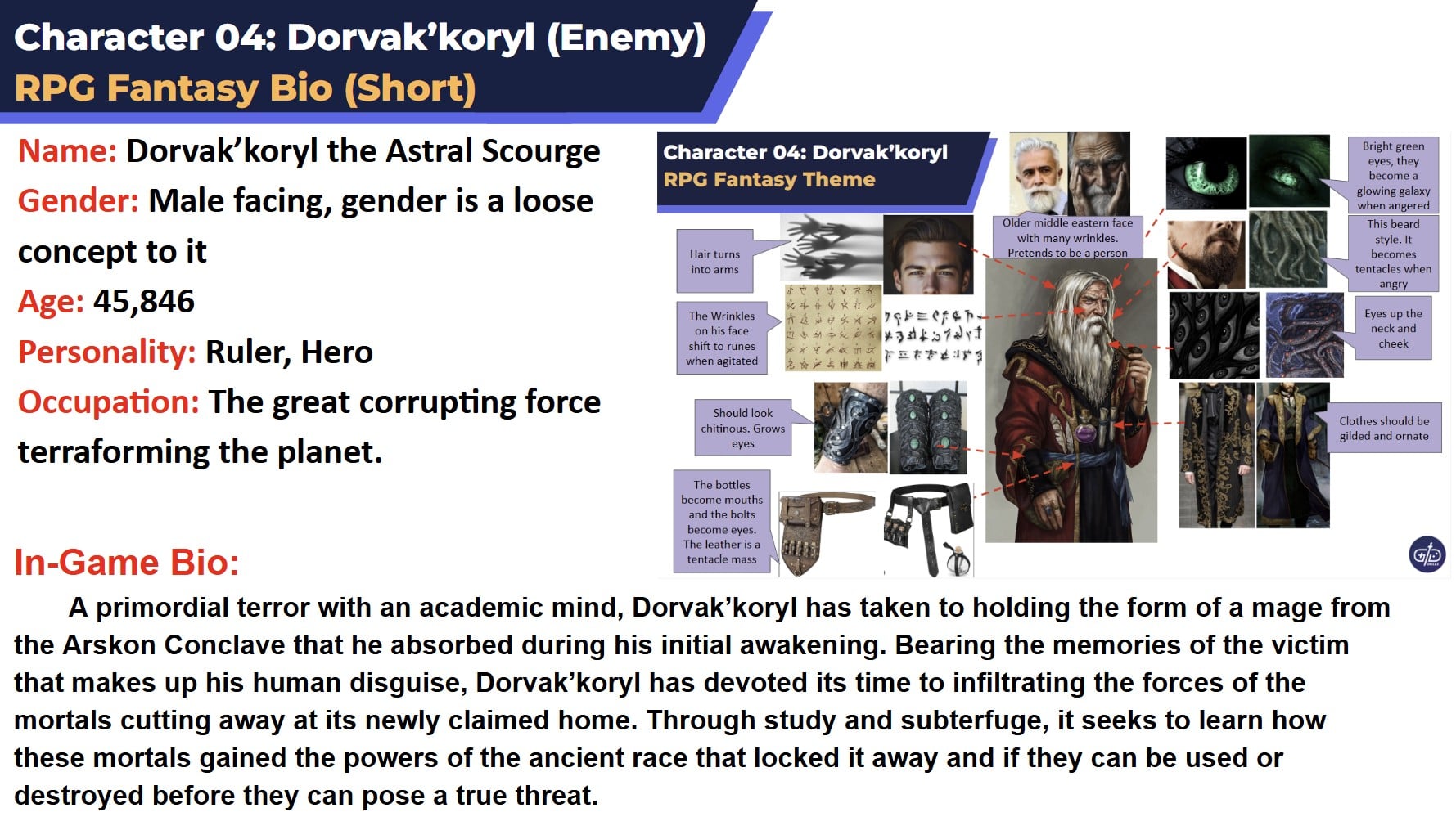 2. Crafting his personality and motives within the theme of academic curiosity of his foes and designing his magic to be consumptive to reflect the Arskon Covenant