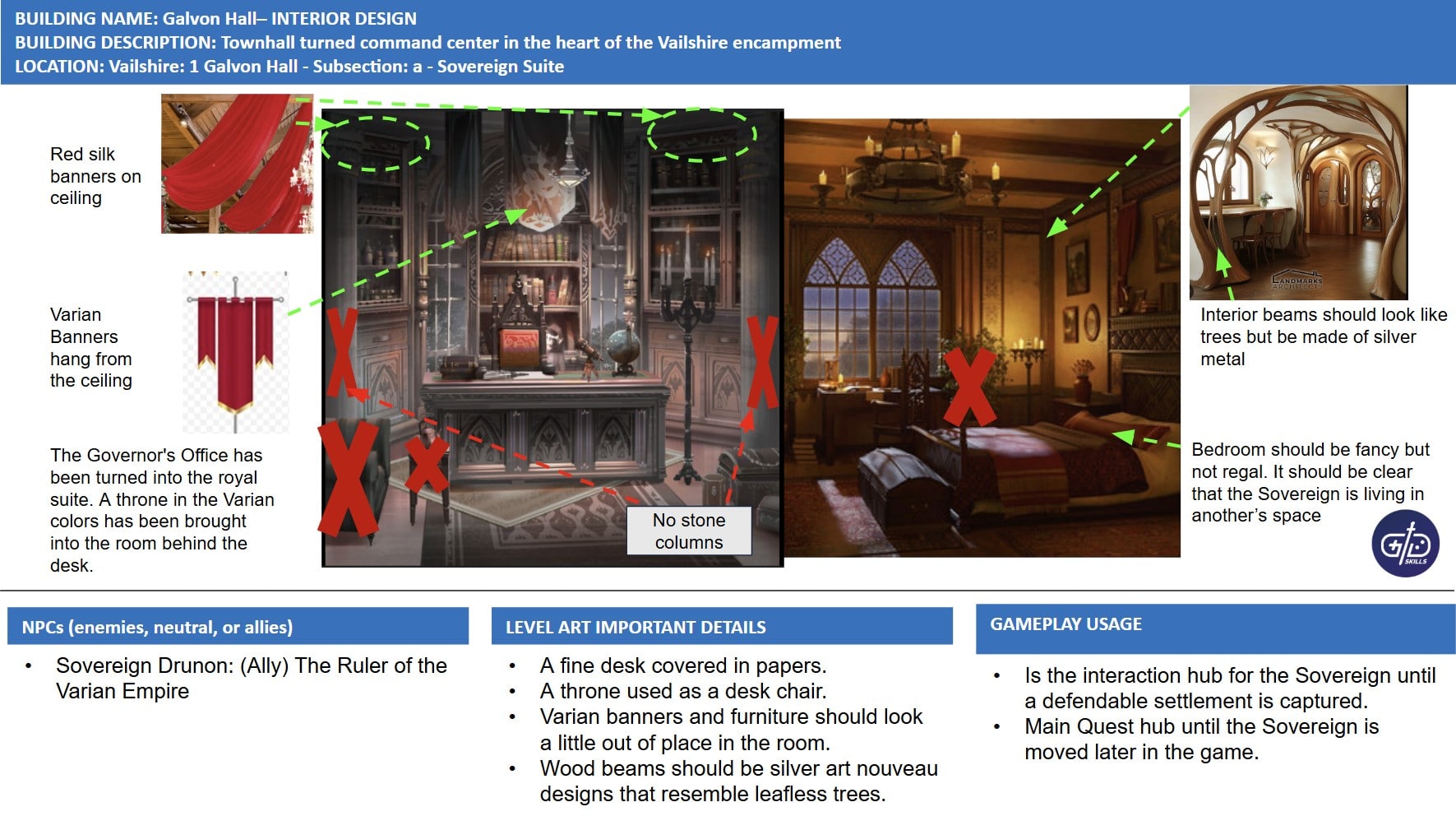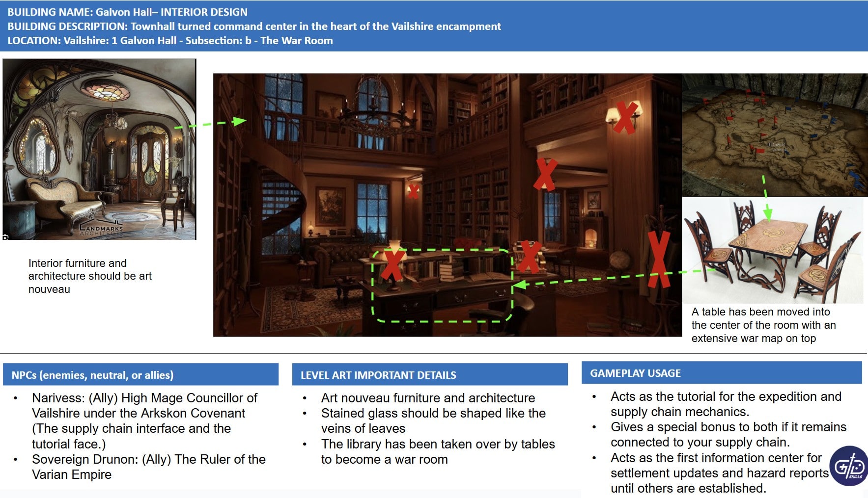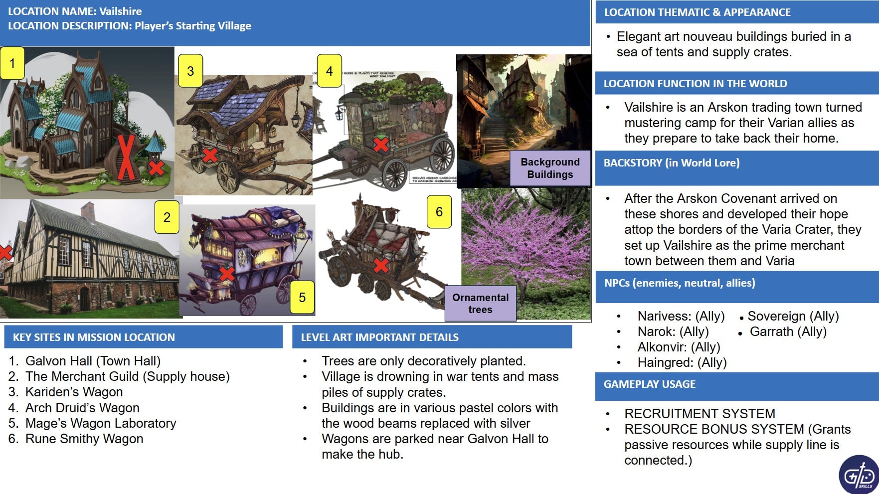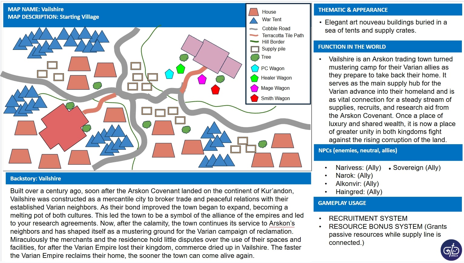 3. Included a brief backstory, notes on world function and gameplay usage, and a list of present NPCs for the design team’s quick reference