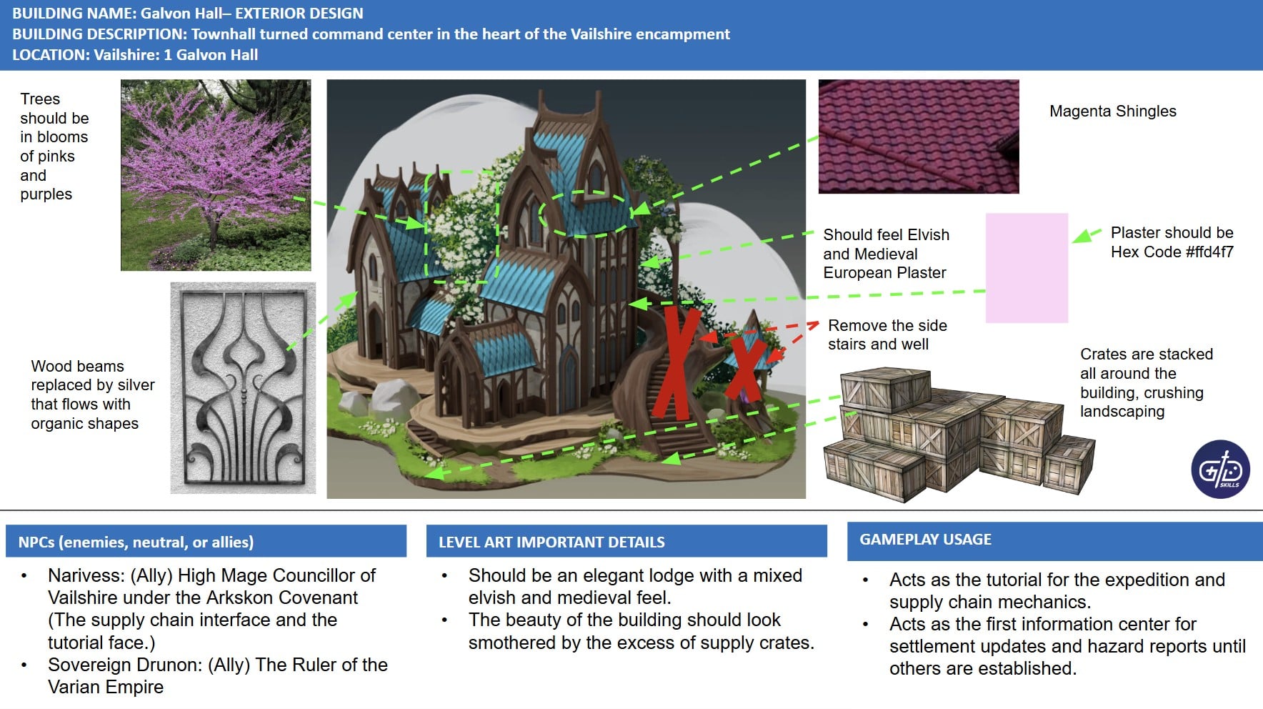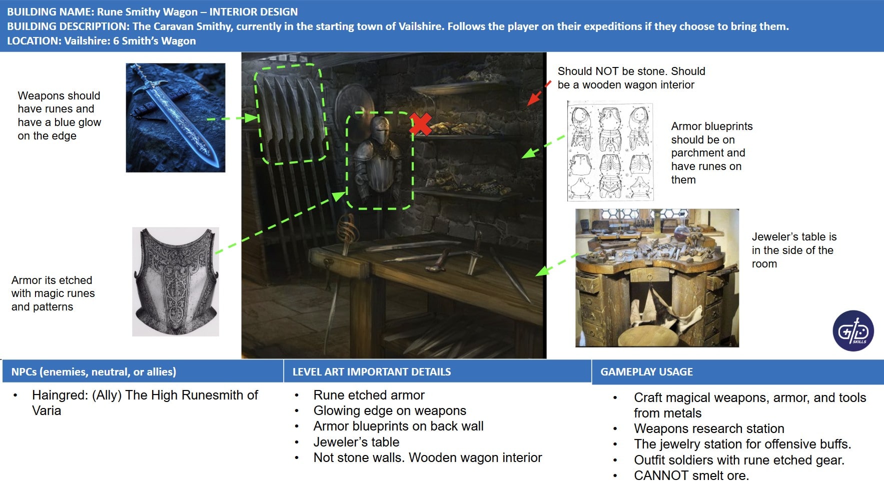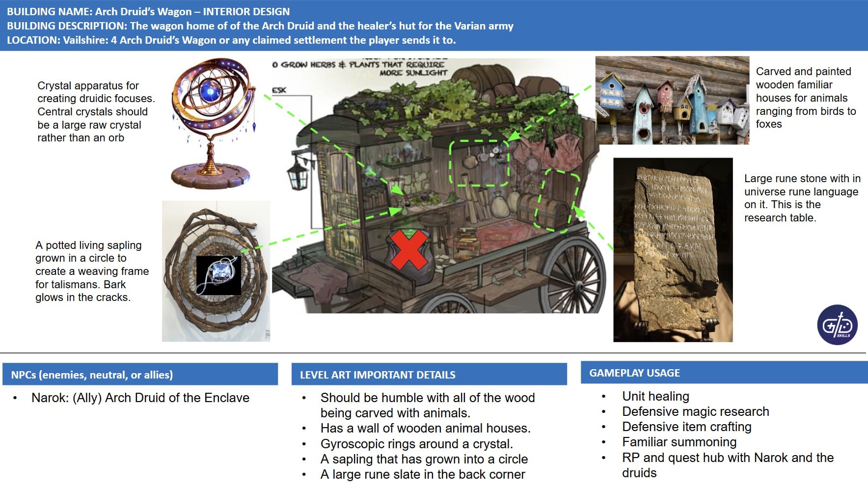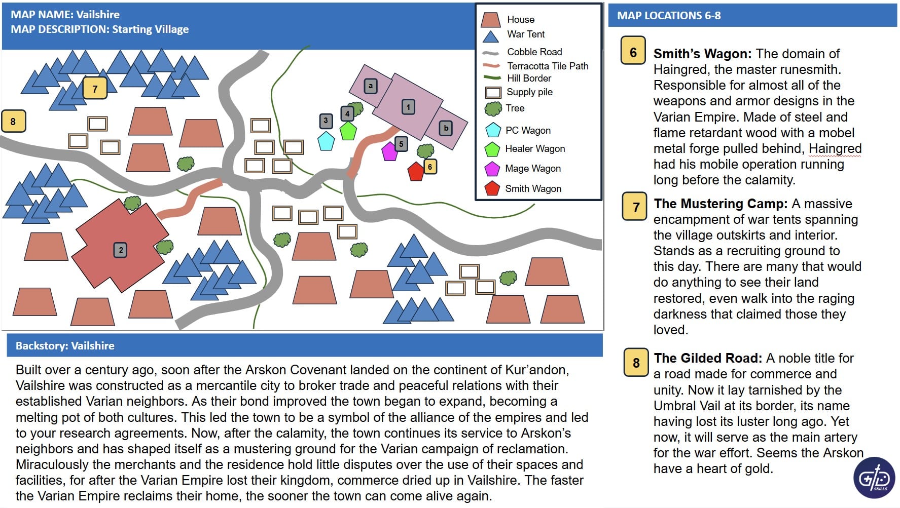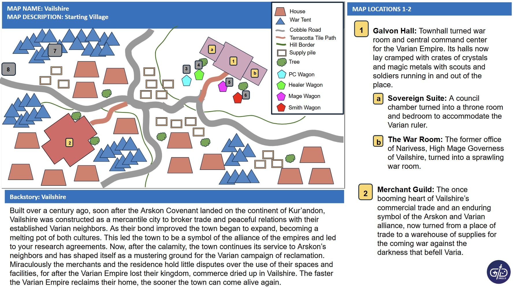 3. Included a brief backstory, notes on world function and gameplay usage, and a list of present NPCs for the design team’s quick reference