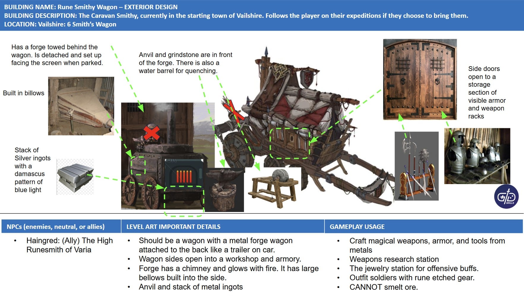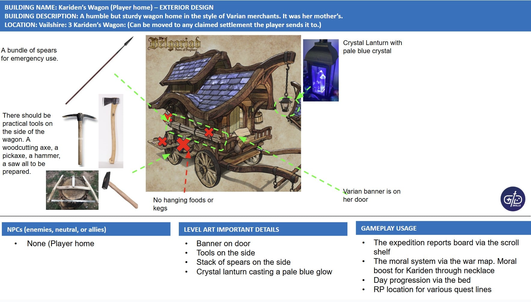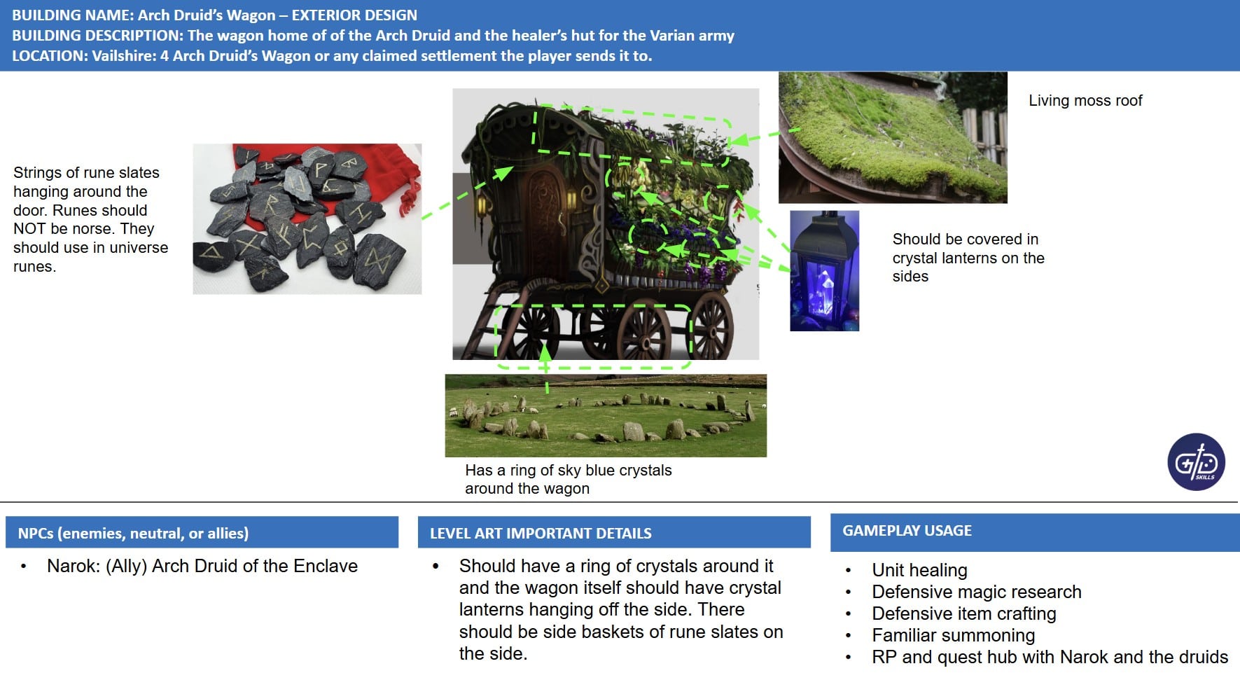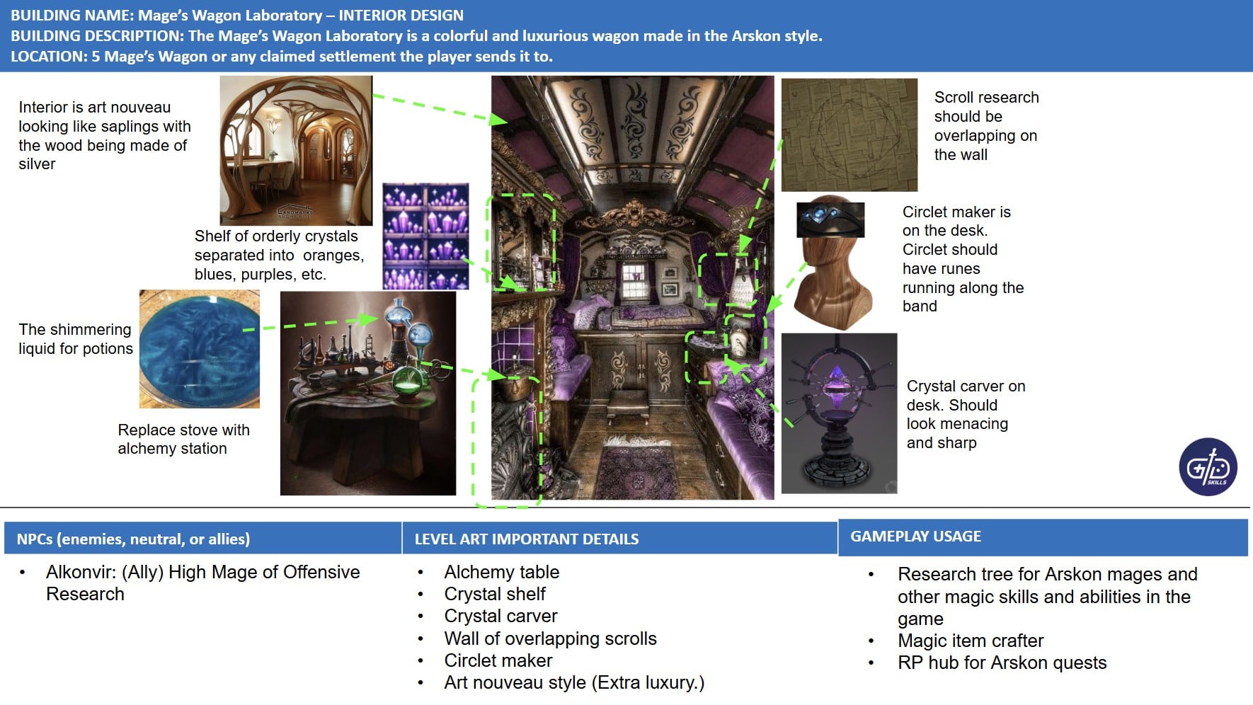 3. Included a brief backstory, notes on world function and gameplay usage, and a list of present NPCs for the design team’s quick reference