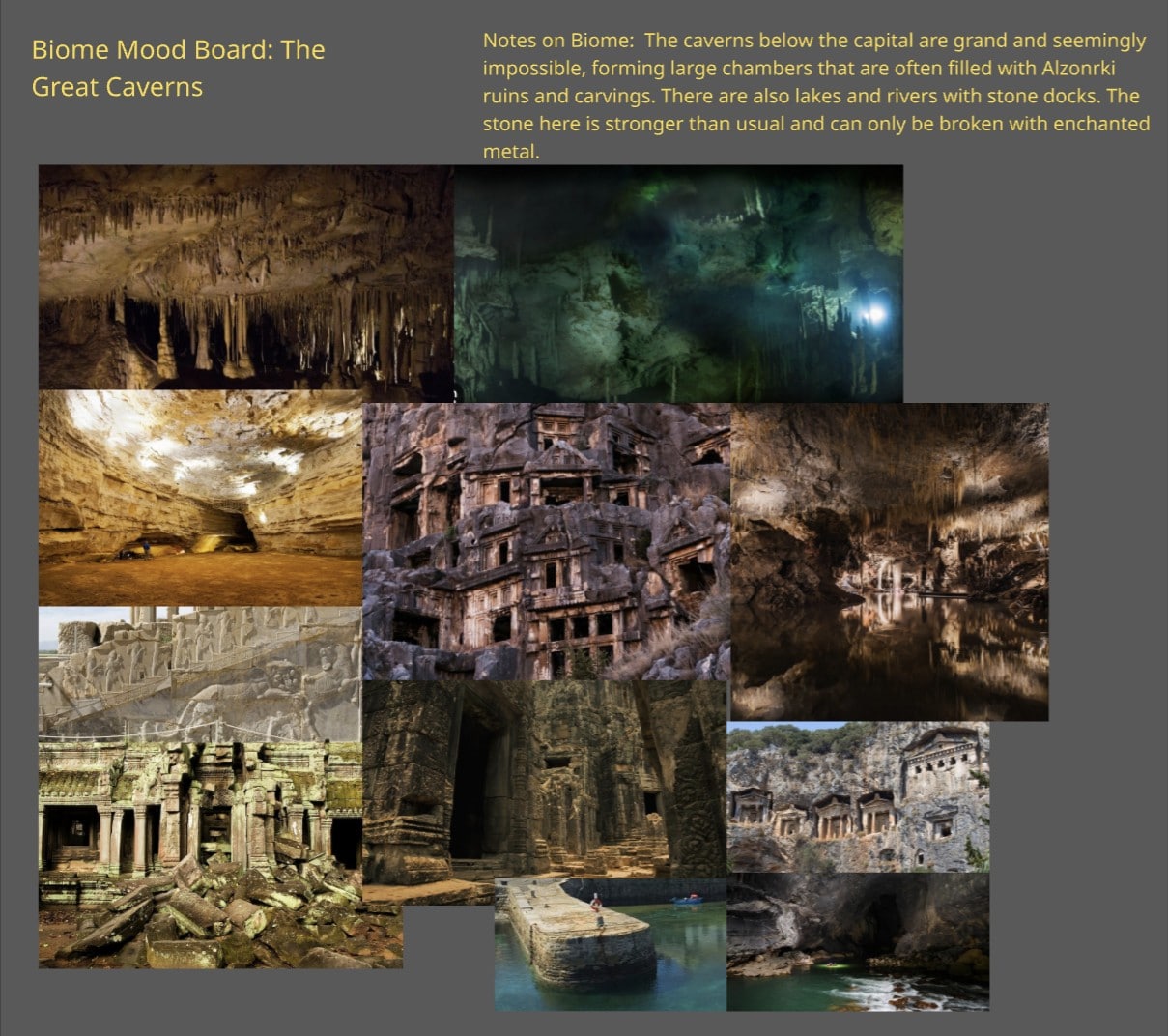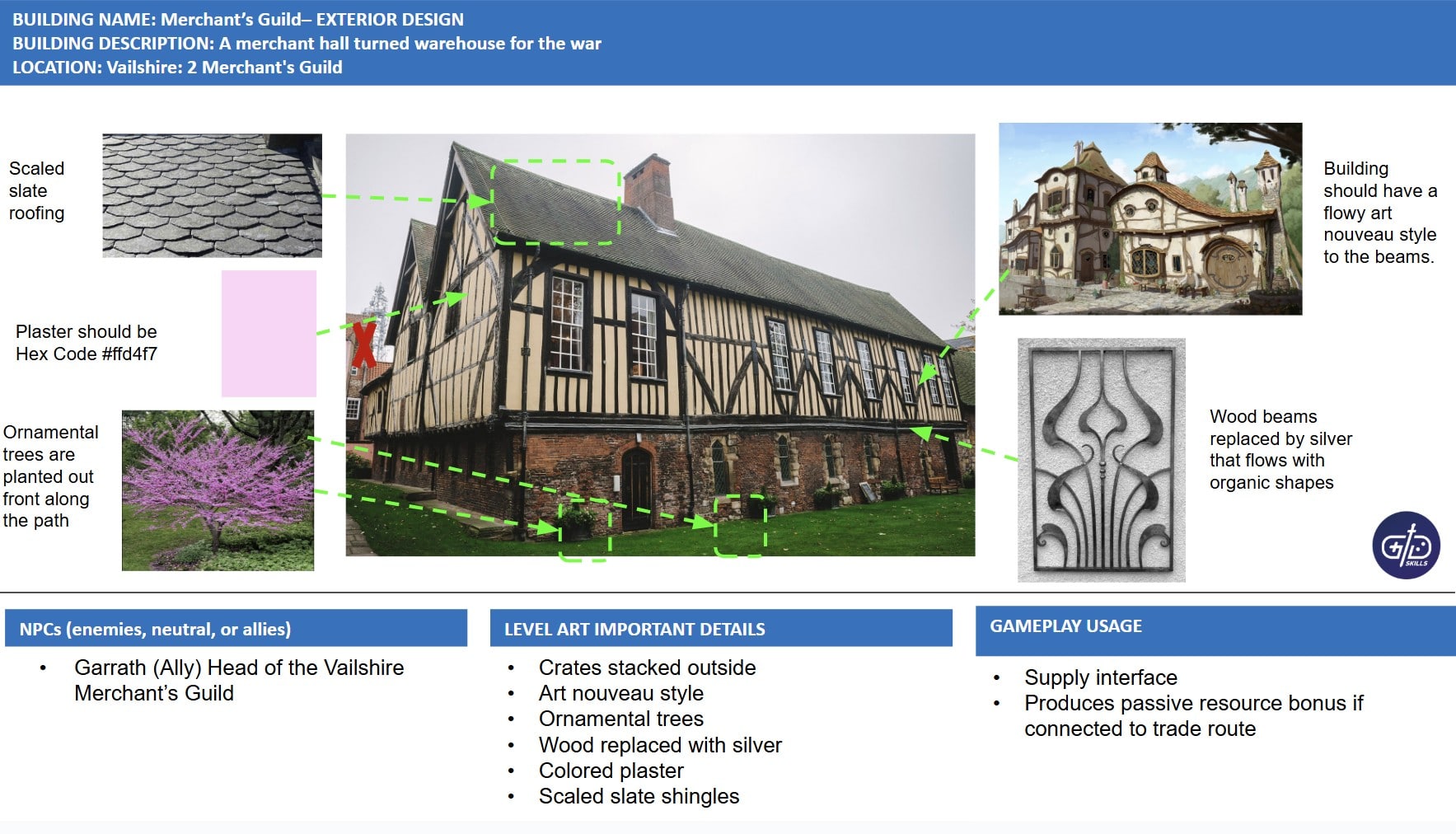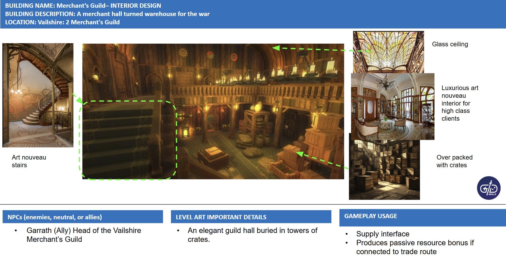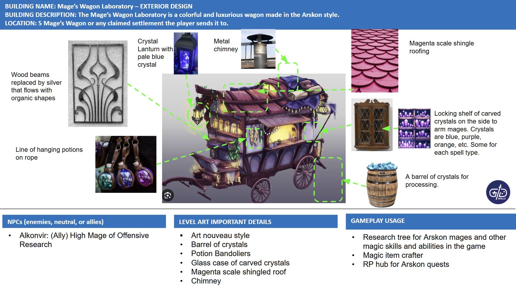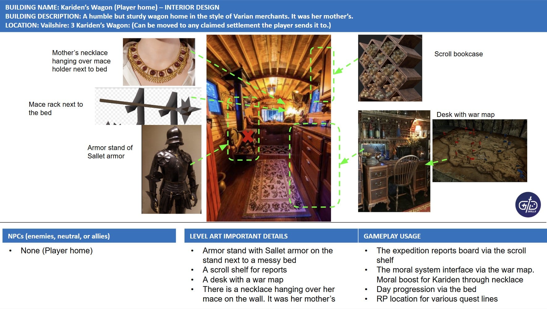 3. Included a brief backstory, notes on world function and gameplay usage, and a list of present NPCs for the design team’s quick reference