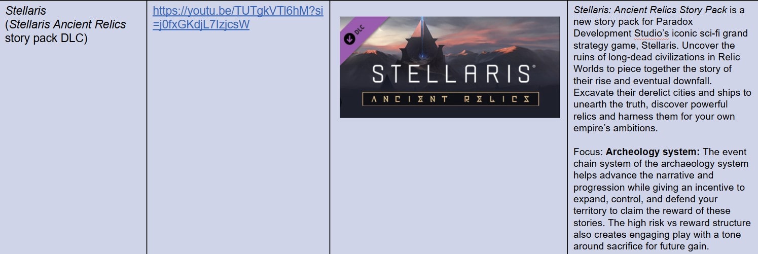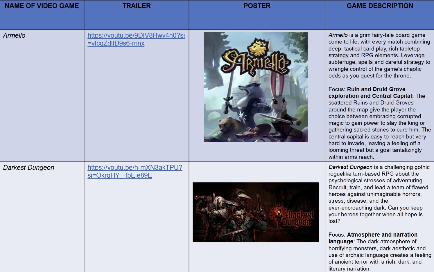 Performed high-level research document to help determine the game’s popularity and help the marketing team do preliminary research with the target audience, by critically consuming content from similar games as well as movies and shows that share narrative themes: