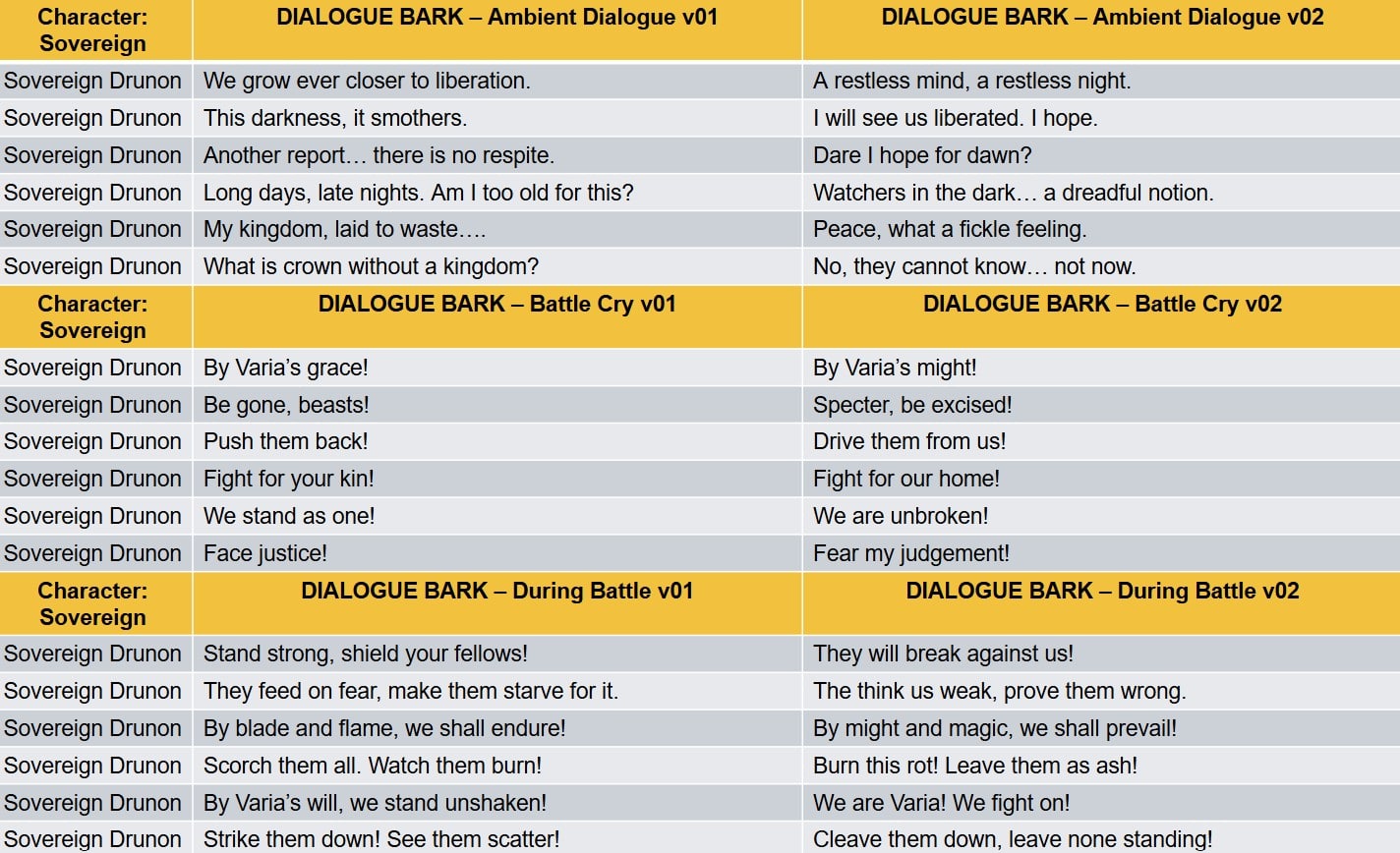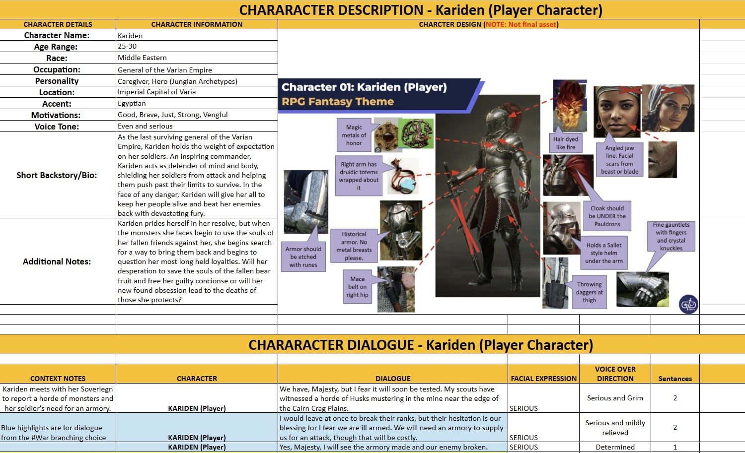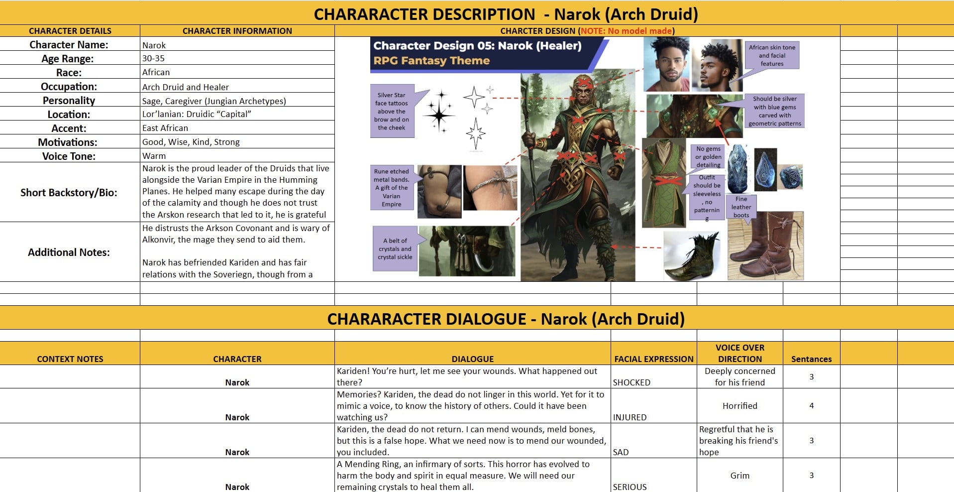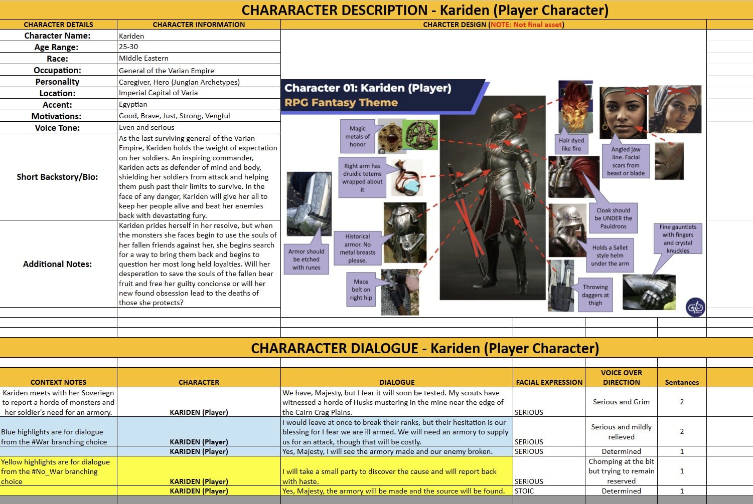 Created four Voice Over Actor documents for the Player Character, two quest characters, and the enemy leader (Kariden, Sovereign Drunon, Narok, and Dorvak’koryl, respectively) that provided detailed information to support the actor and provide faster and better voice recording sessions.