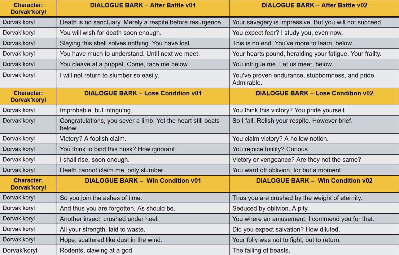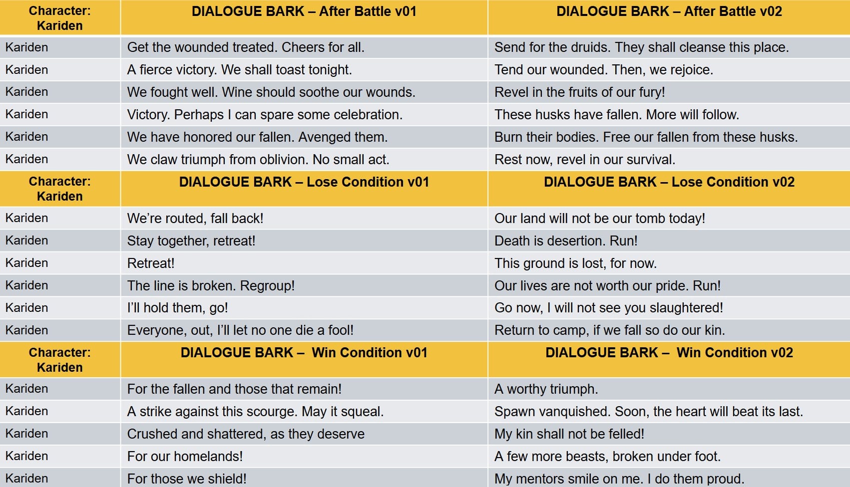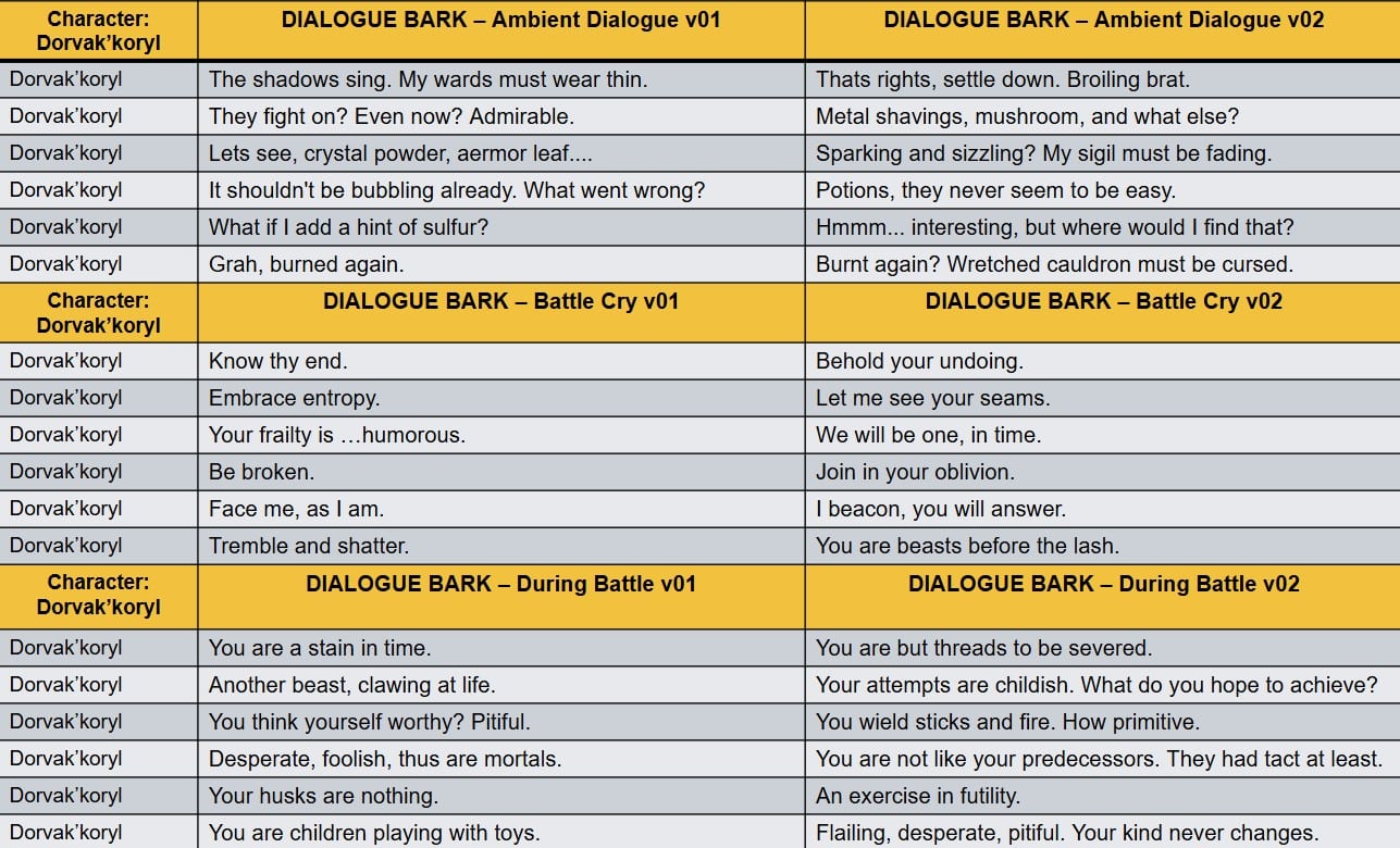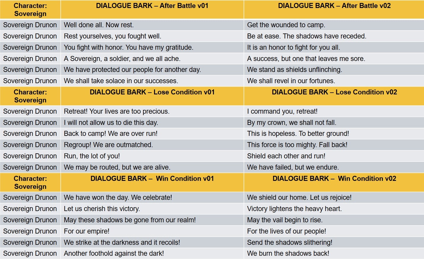 Created four Voice Over Actor documents for the Player Character, two quest characters, and the enemy leader (Kariden, Sovereign Drunon, Narok, and Dorvak’koryl, respectively) that provided detailed information to support the actor and provide faster and better voice recording sessions.