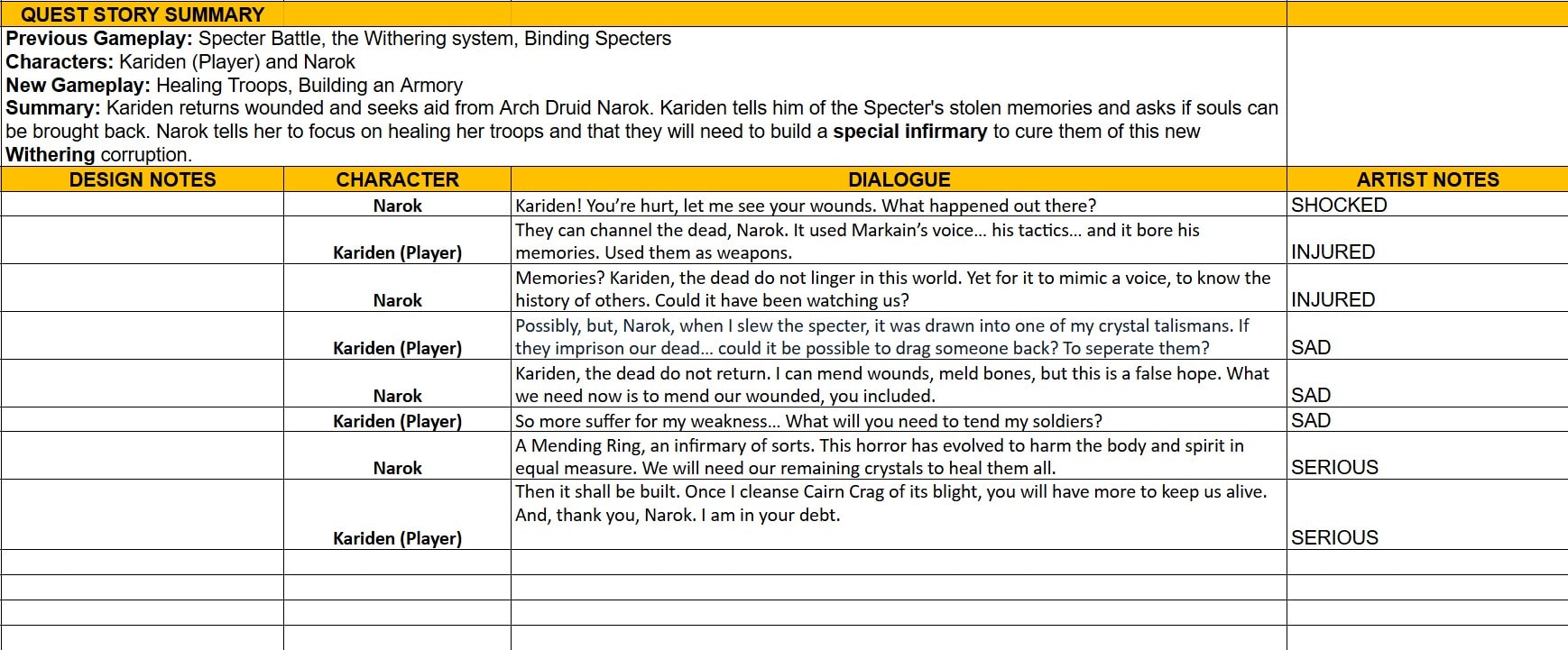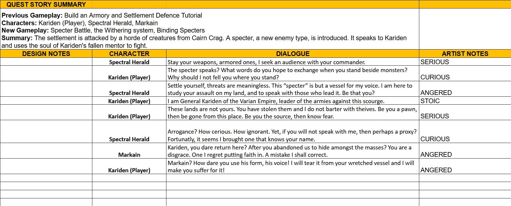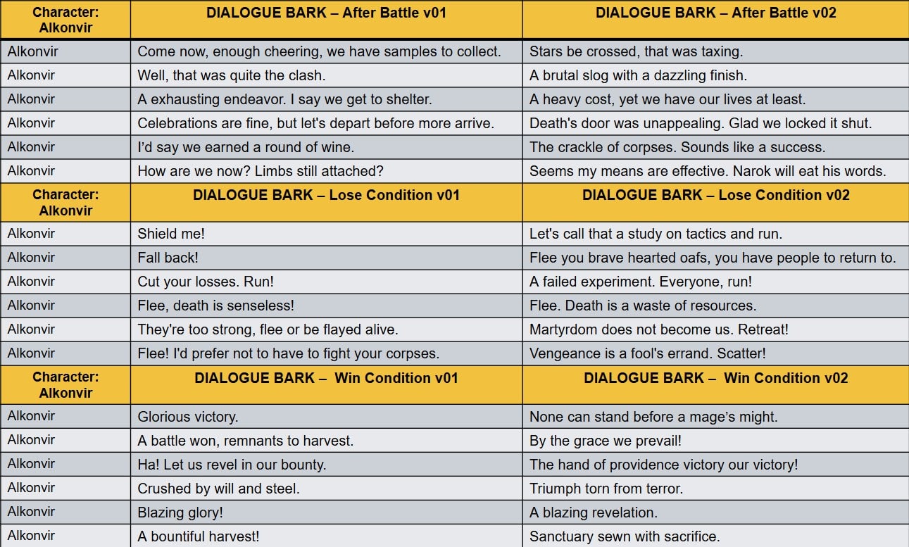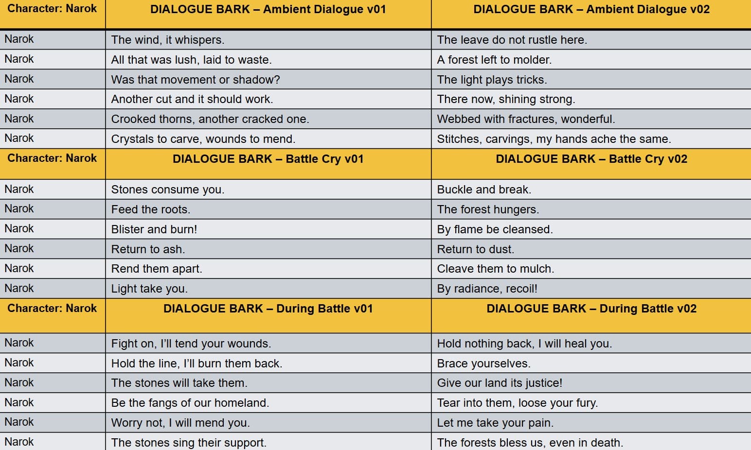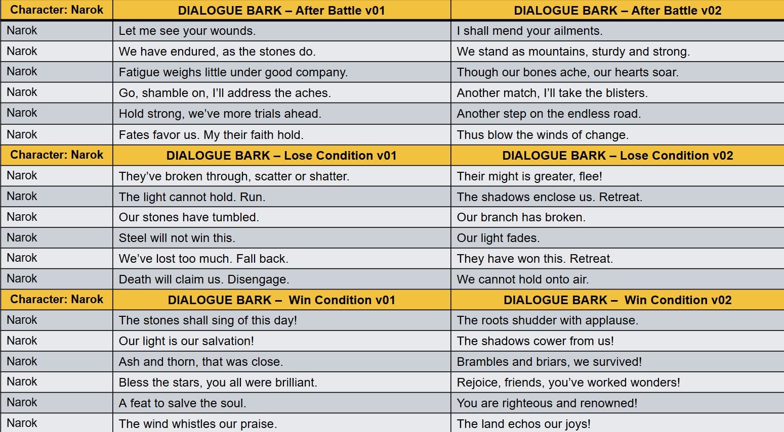 Created four Voice Over Actor documents for the Player Character, two quest characters, and the enemy leader (Kariden, Sovereign Drunon, Narok, and Dorvak’koryl, respectively) that provided detailed information to support the actor and provide faster and better voice recording sessions.