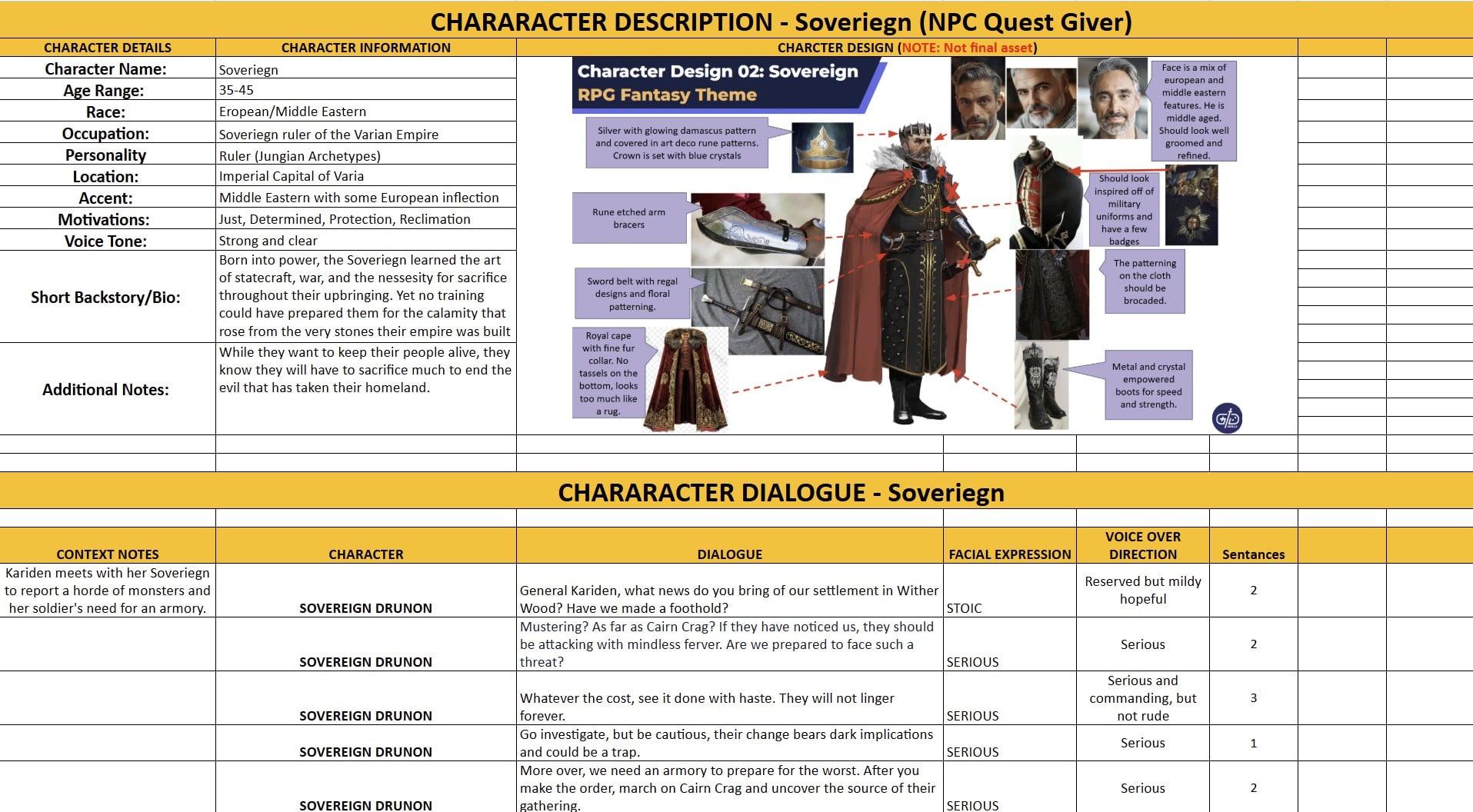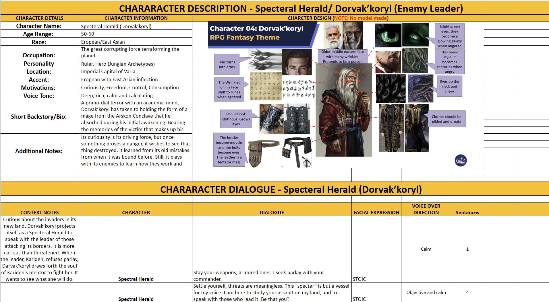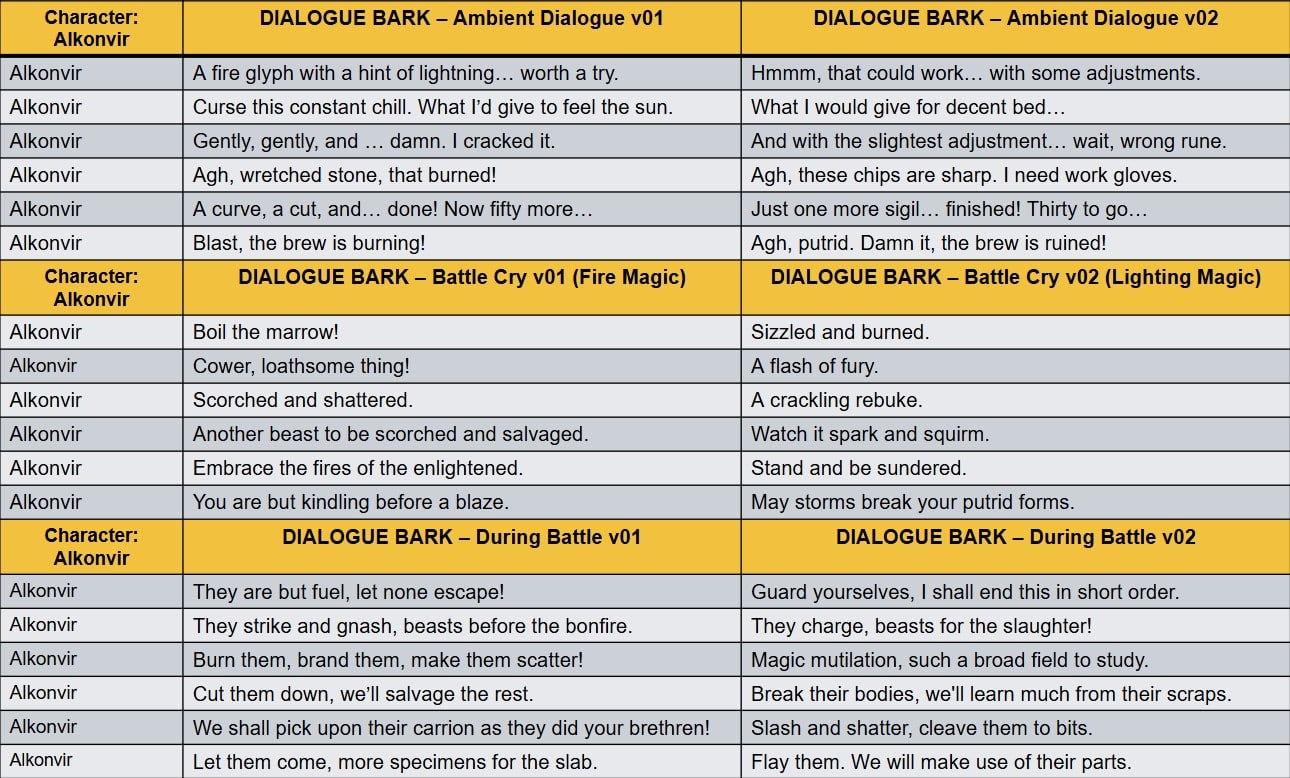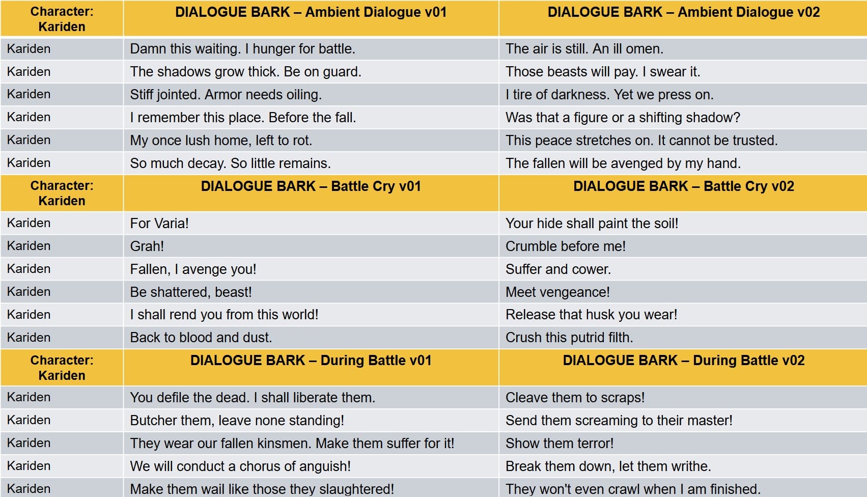 Created four Voice Over Actor documents for the Player Character, two quest characters, and the enemy leader (Kariden, Sovereign Drunon, Narok, and Dorvak’koryl, respectively) that provided detailed information to support the actor and provide faster and better voice recording sessions.