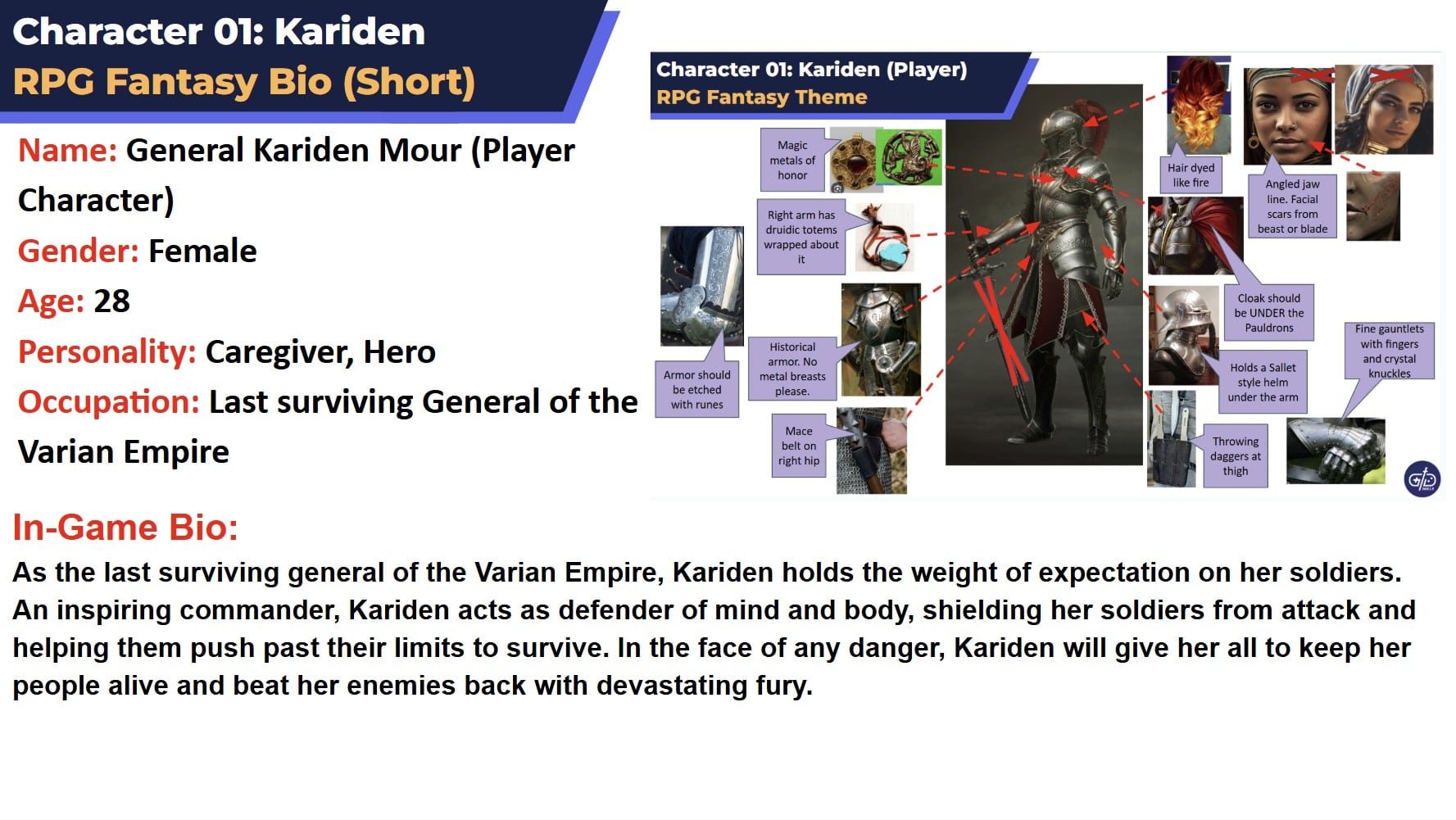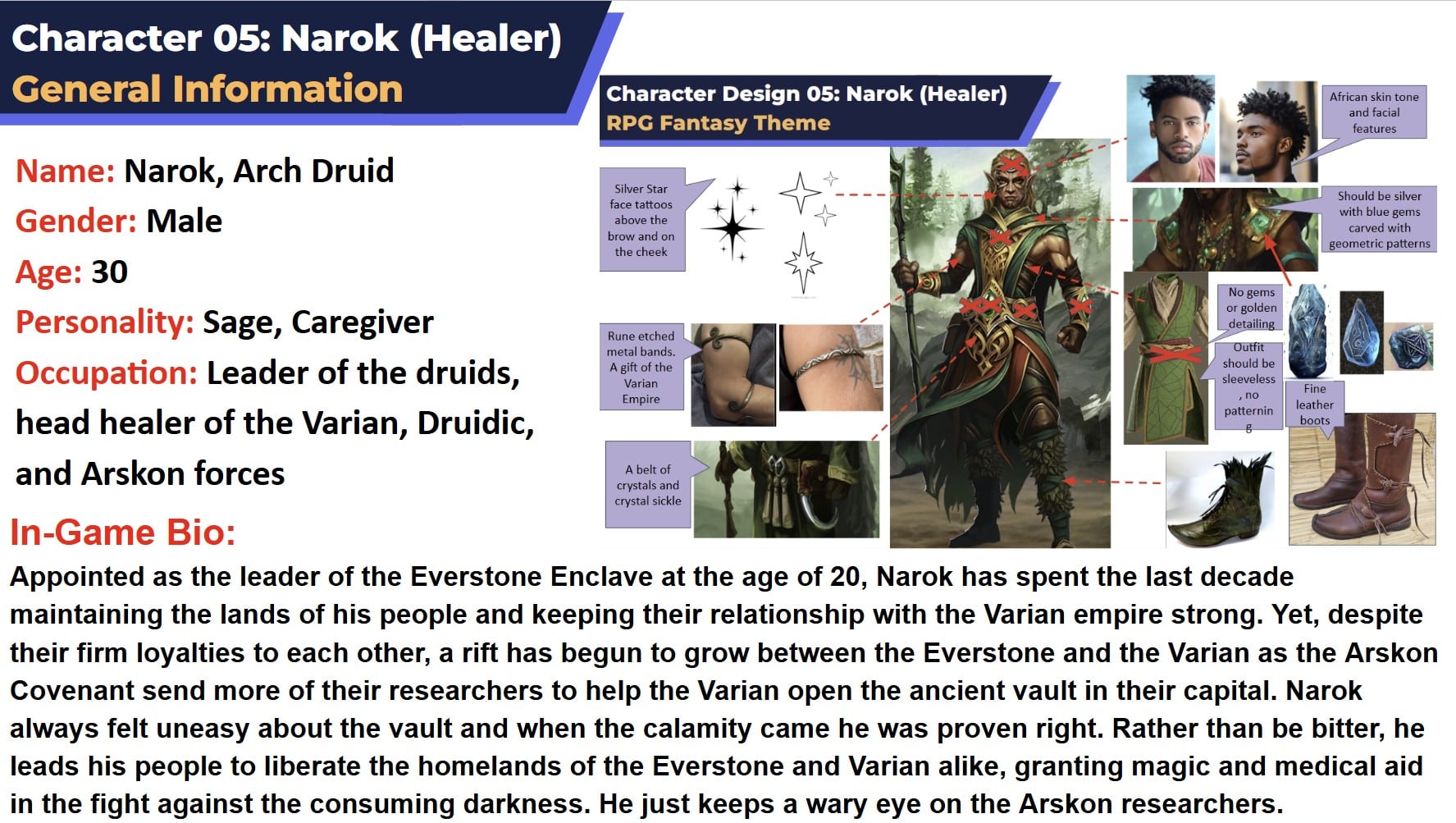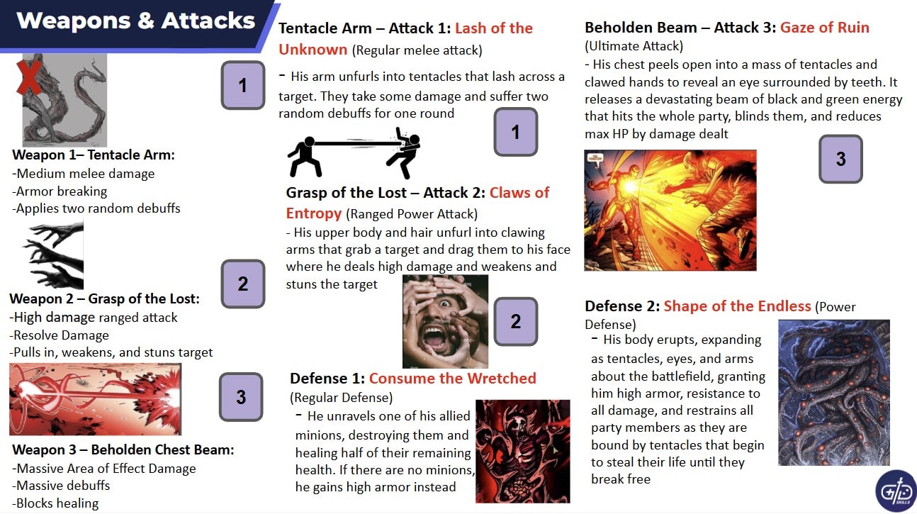 1. Continuity: Researched, designed, and fleshed out character motivations and personality to reflect narrative themes, combat functions, and game mechanics