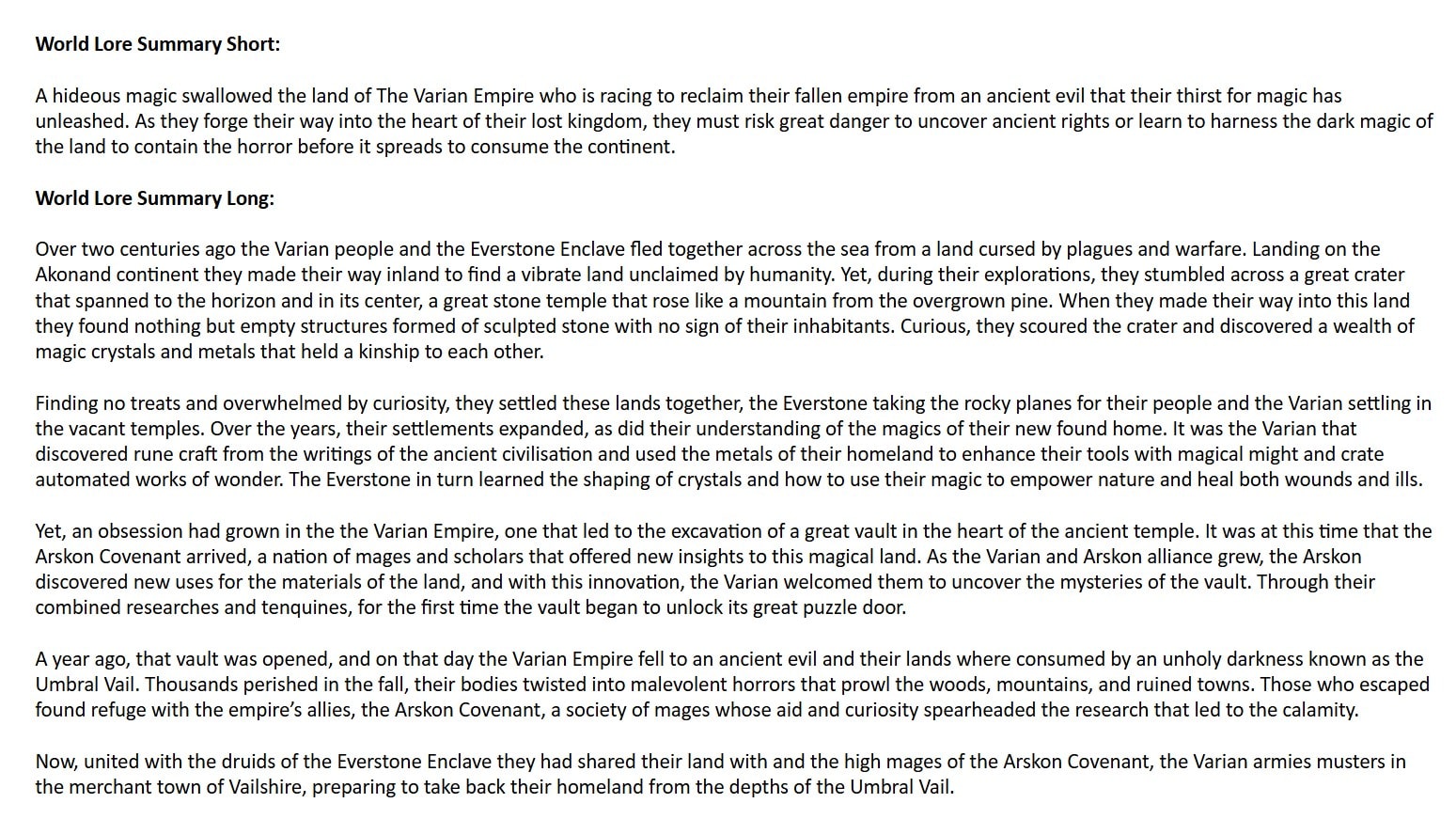 3. Created prehistory and mythos as a foundation for the mid and late game where players will explore ancient ruins and harness forgotten magic to defeat the antagonist while showing rich lore and environments for various player types