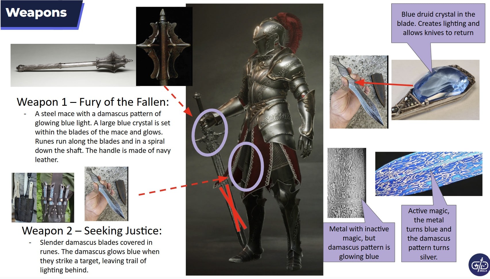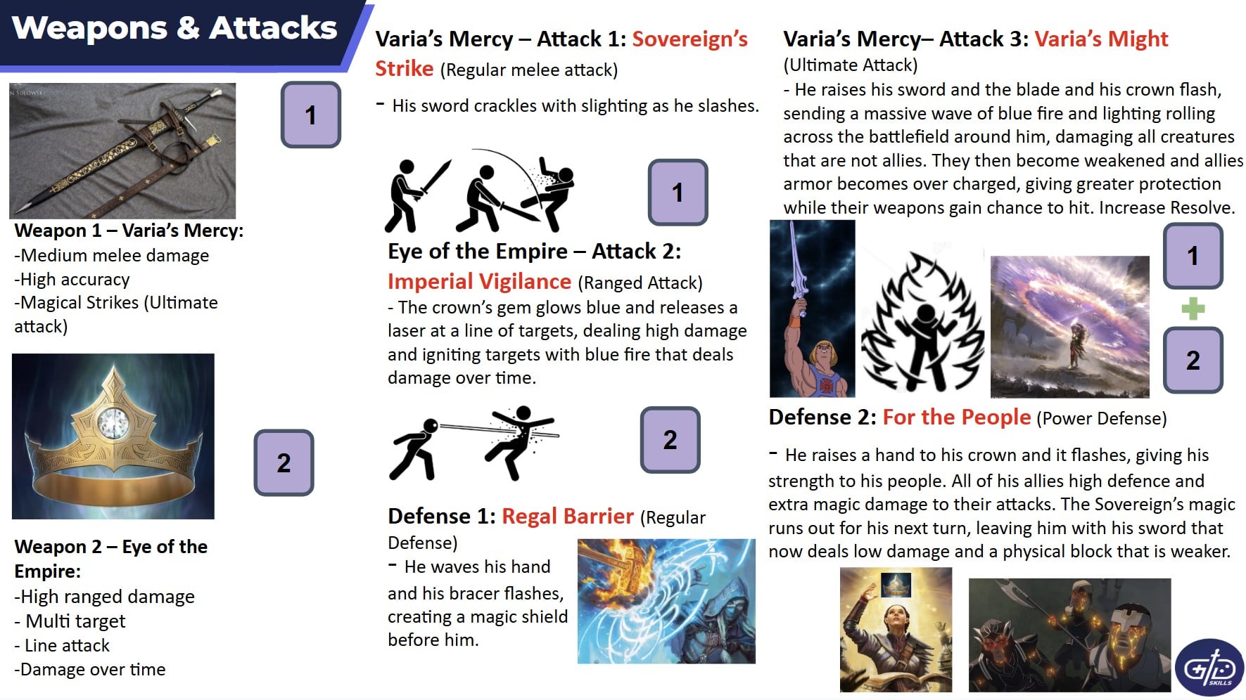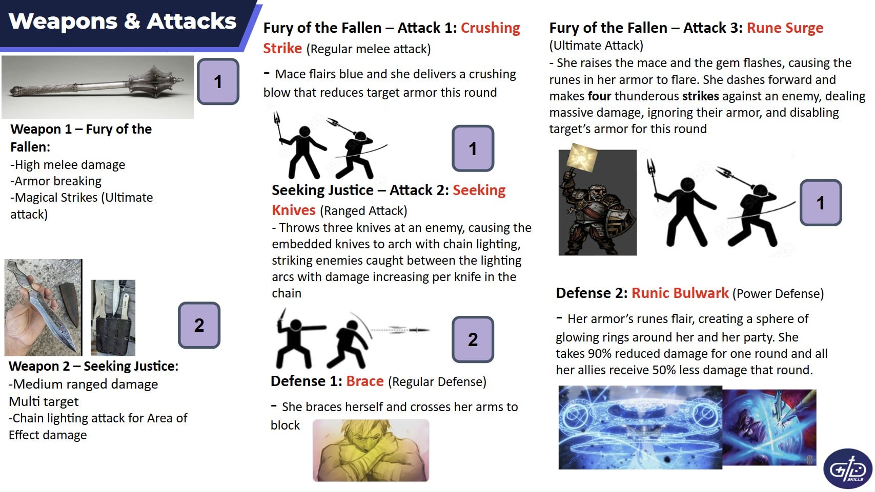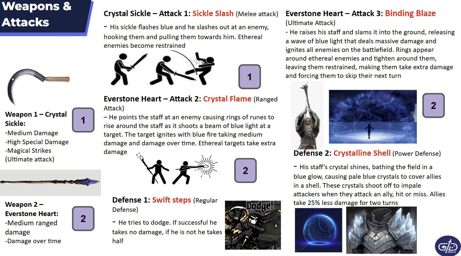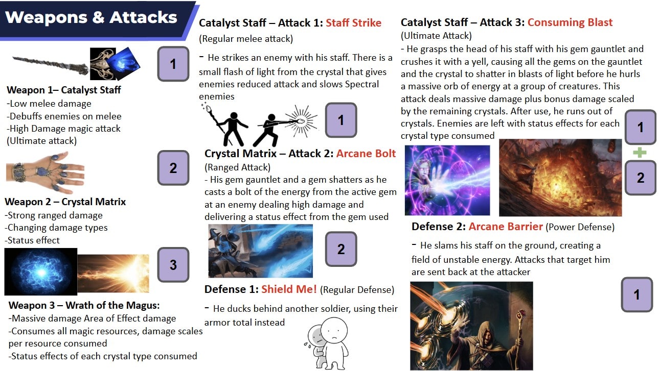 3. Character Combat: Supported the combat designer by designing unique weapons and attacks for each character, as well as naming and describing their attacks