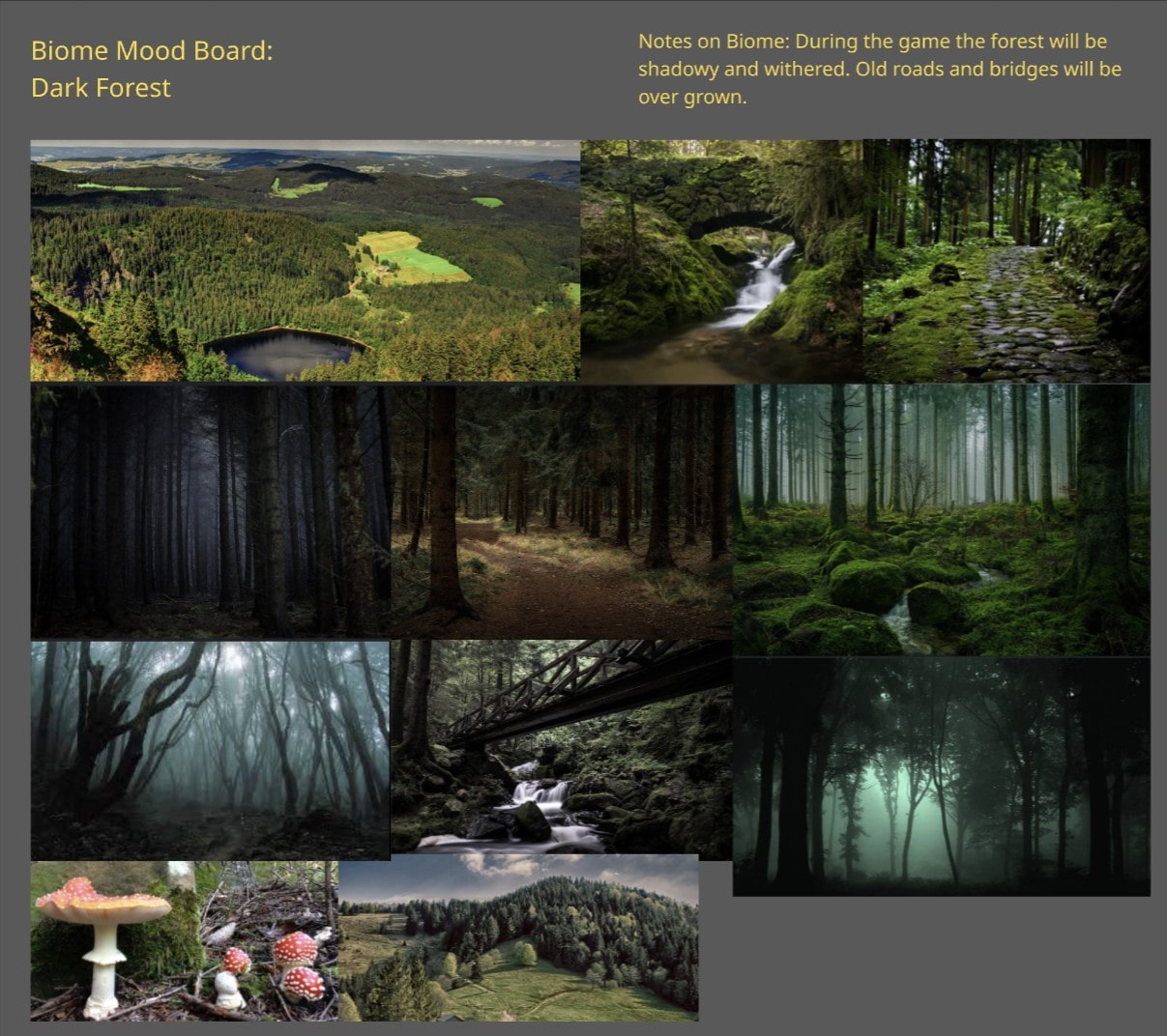 1. Researched rich wooded climates to tie into the dark fantasy theme of the game