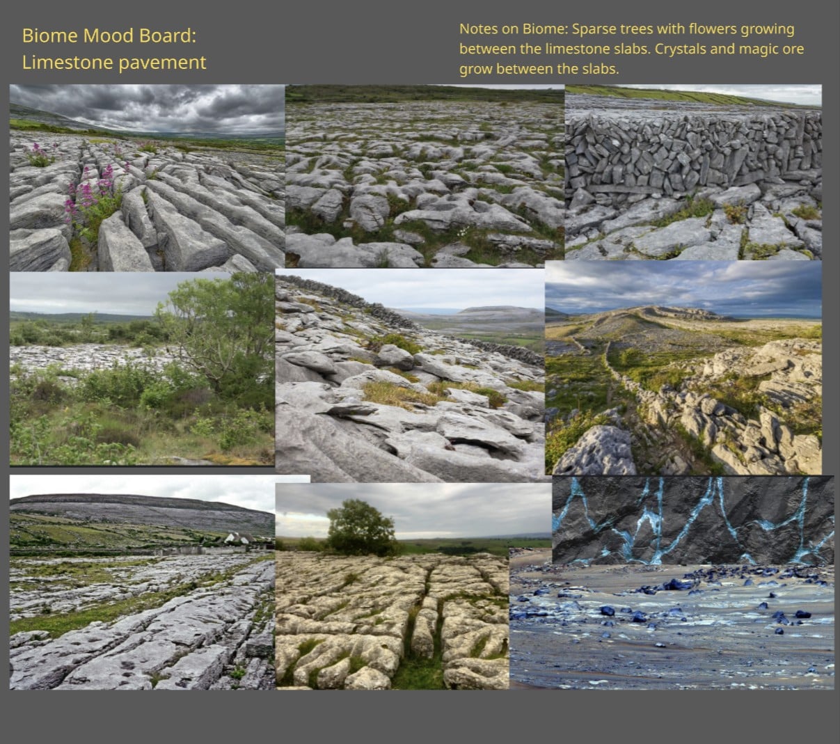 2. Researched the limestone pavement of Ireland to create an alien stony atmosphere where the magic metals and crystals can be found on the surface, and trees can be limited to push player choice for which locations to occupy as they balance their resources