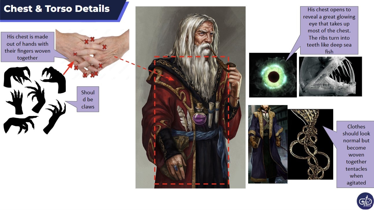3. Thematic Madness: Achieve the narrative themes of the dangers of dehumanization by shaping his obsession with self-modification and magical enhancement to conflict with the Player Character’s morals and motivations by having him gradually devalue natural life and view others as resources or works to improve upon