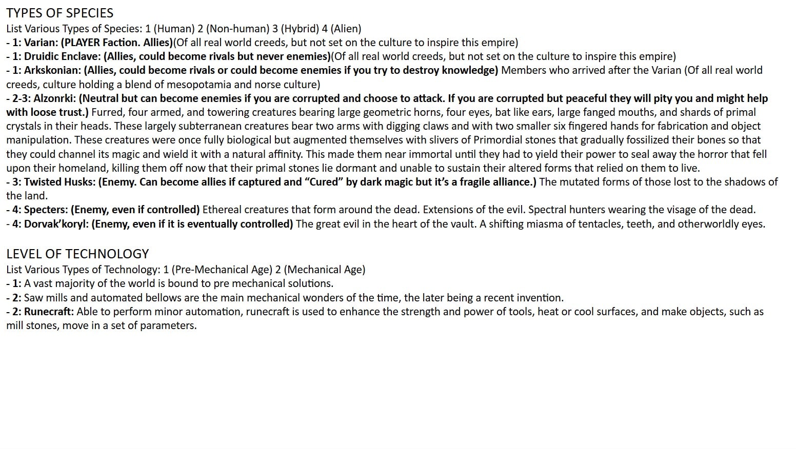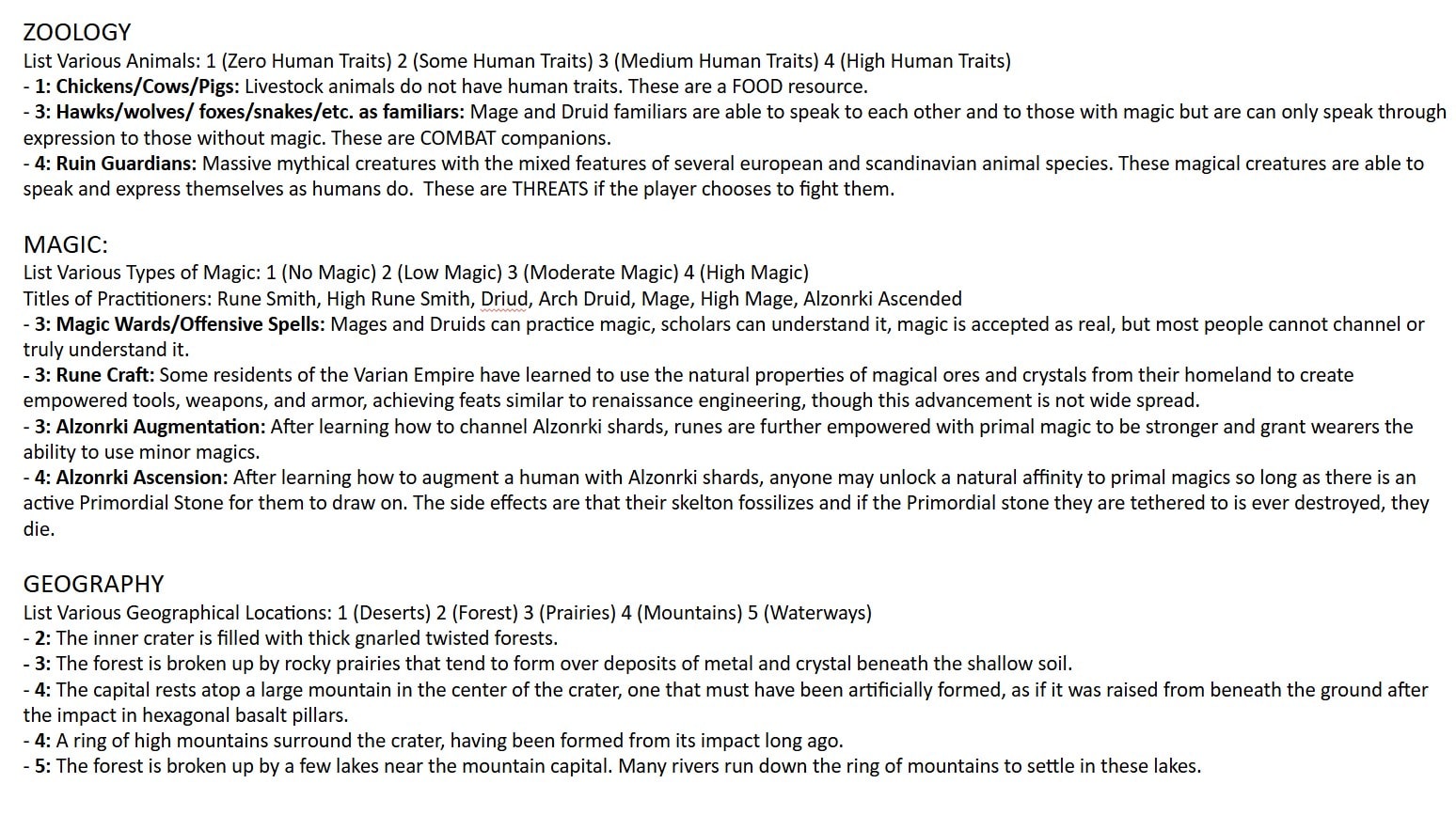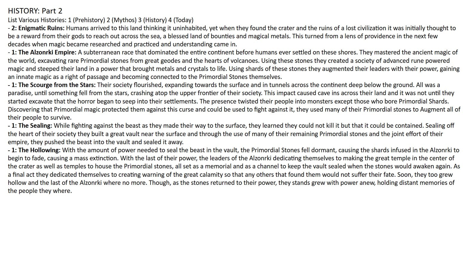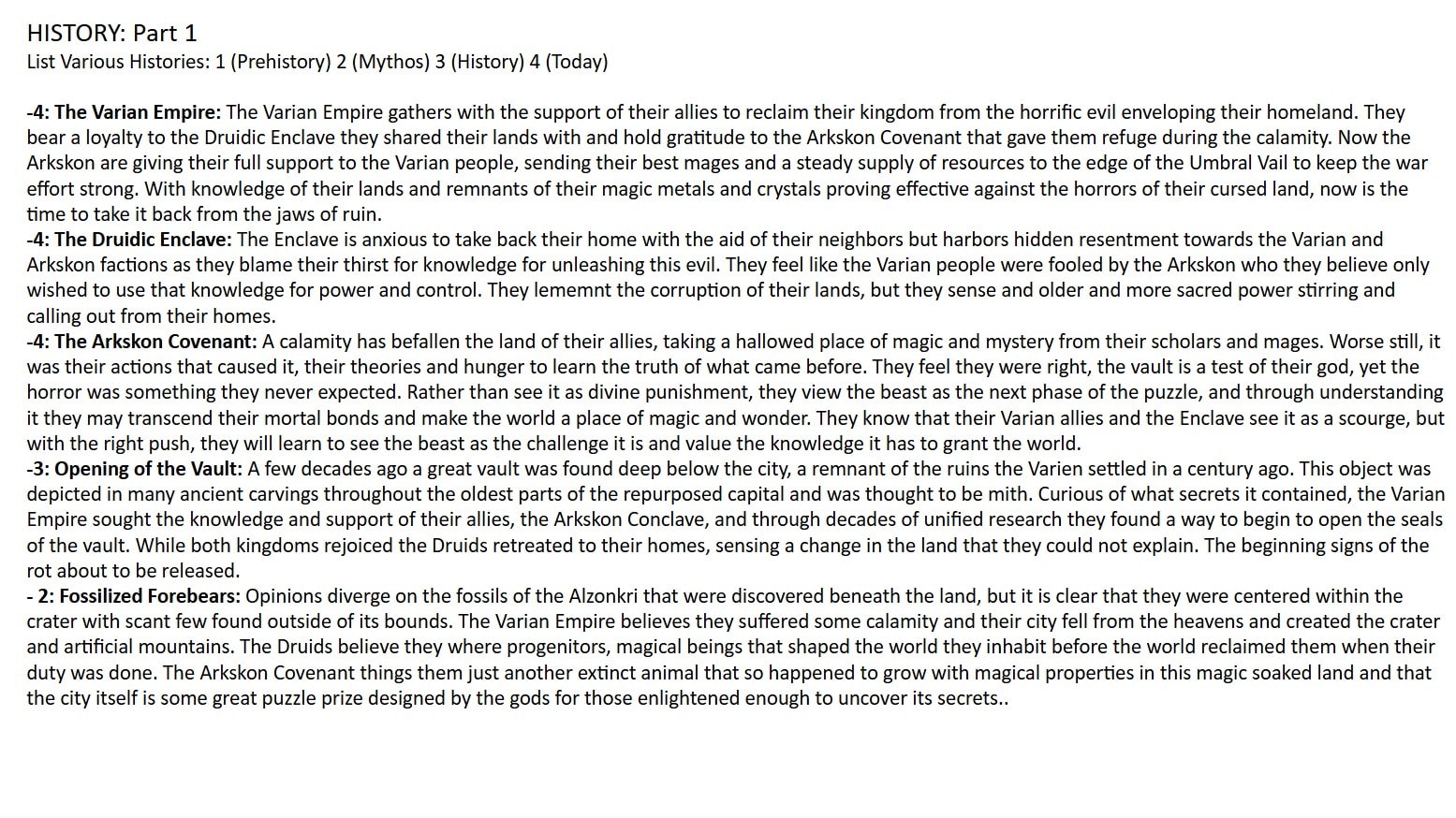 1. Included prehistory, mythos, history, and current history to inform the state of the world at the start of the game to create a fantasy for the players.